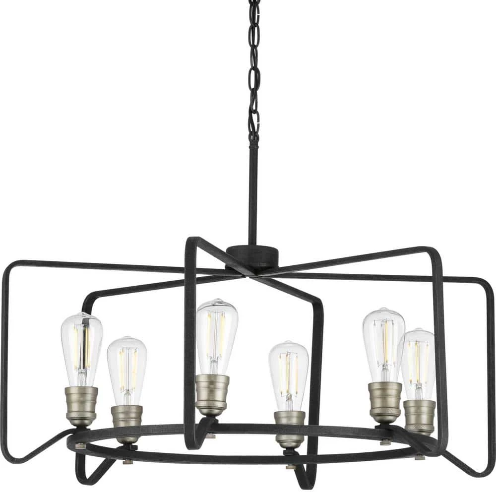 - 6-light chandelier with rounded iron metal arms holding the bulbs in an open, circular design