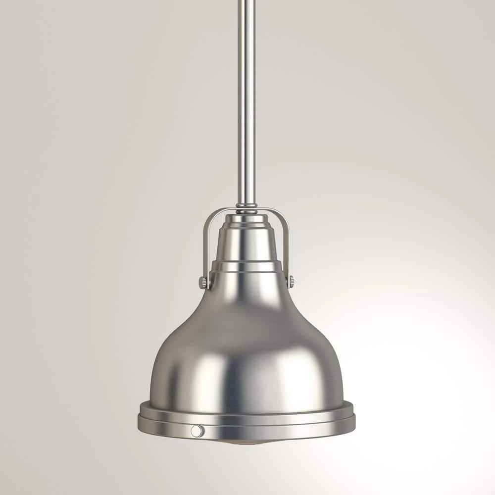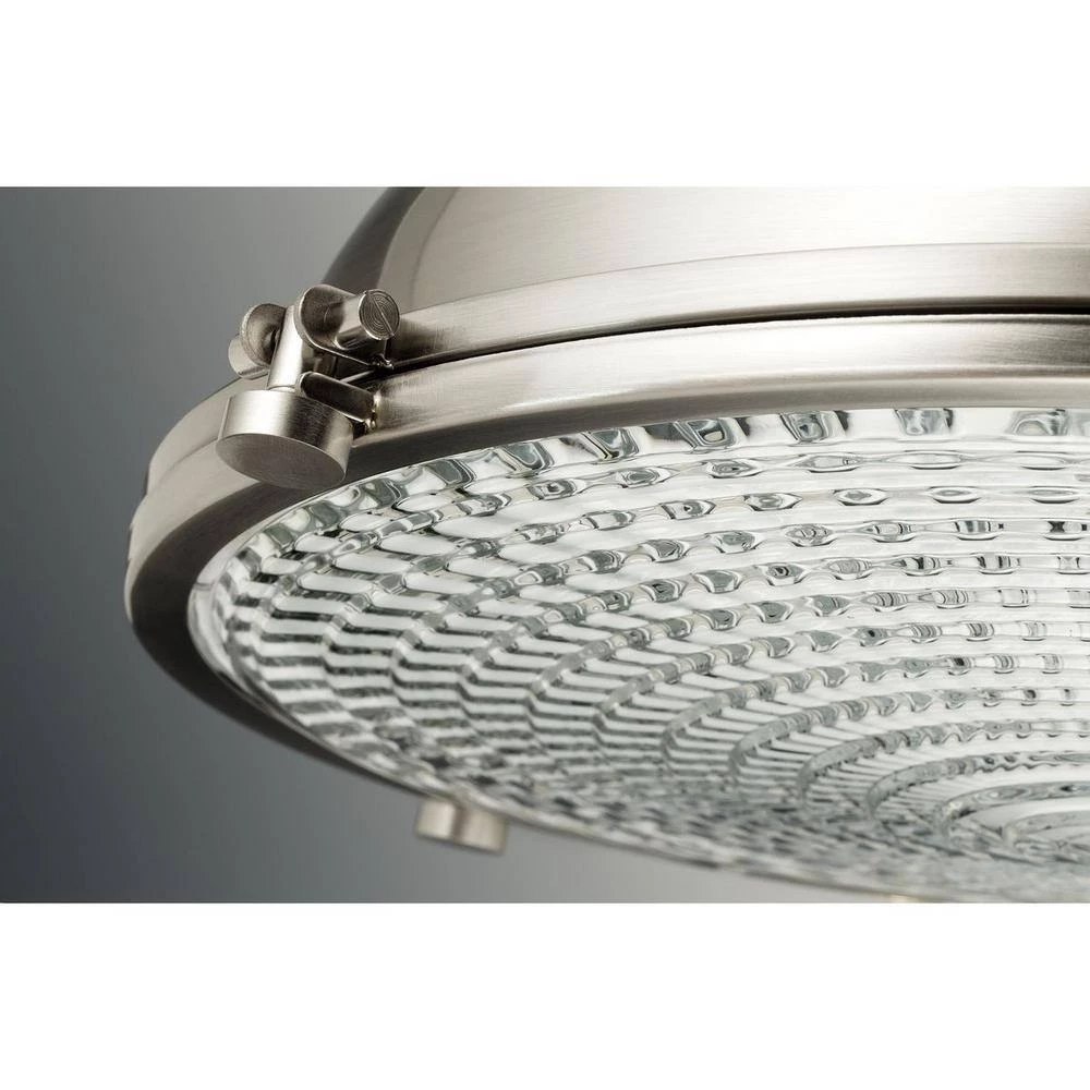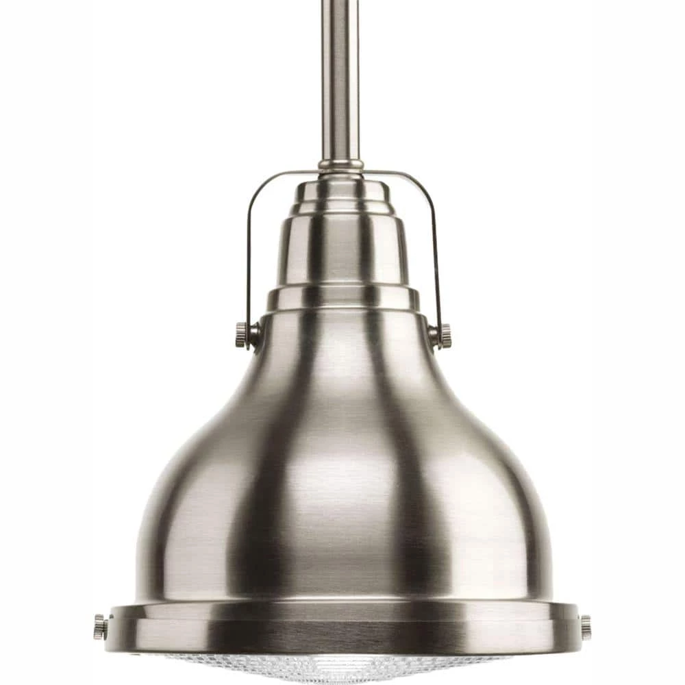 Vintage and modern in styling, this pendant is born from industrial roots in both form and function. An authentic Fresnel Lens type glass lens refracts light from the metal shade. The lens is supported by a series of decorative and functional metal fittings for easy access to change the light bulb when needed. Stem-type hanging system provides several options for installation height and includes 6 in. of chain for installation on sloped ceilings.