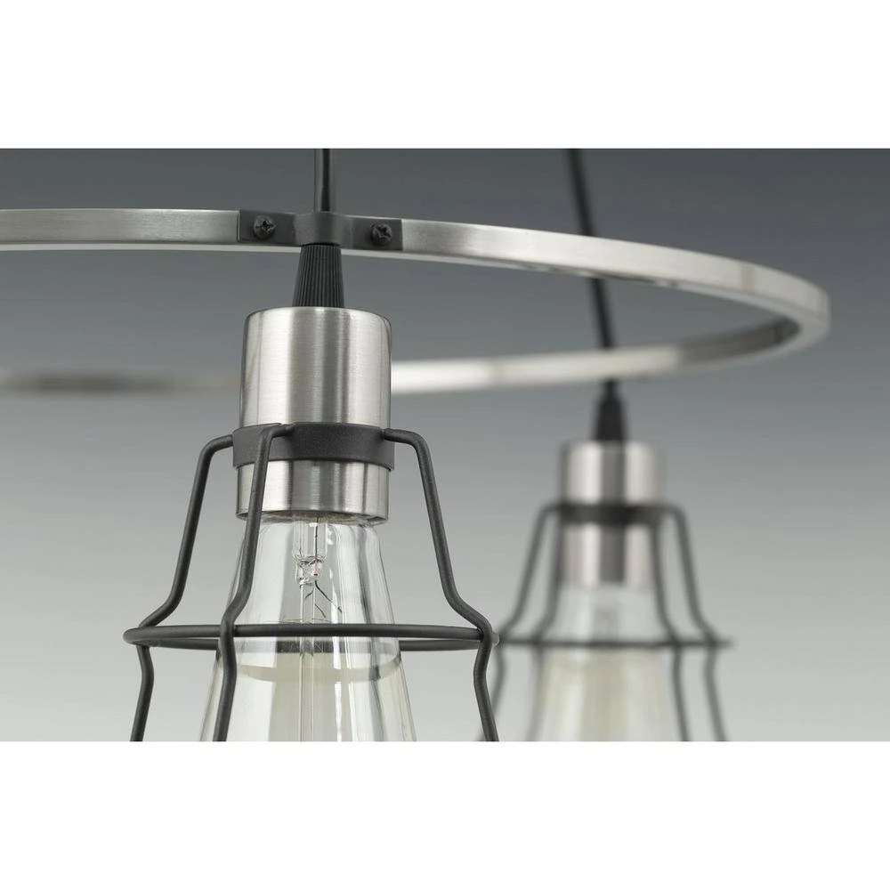Inspired by industrial elements, Gauge features an open cage design that’s both functional and aesthetically appealing. Multi-pendant is supplied with hoop frame to provide an element of customization. Frame is comprised of Graphite with Brushed Nickel accents.