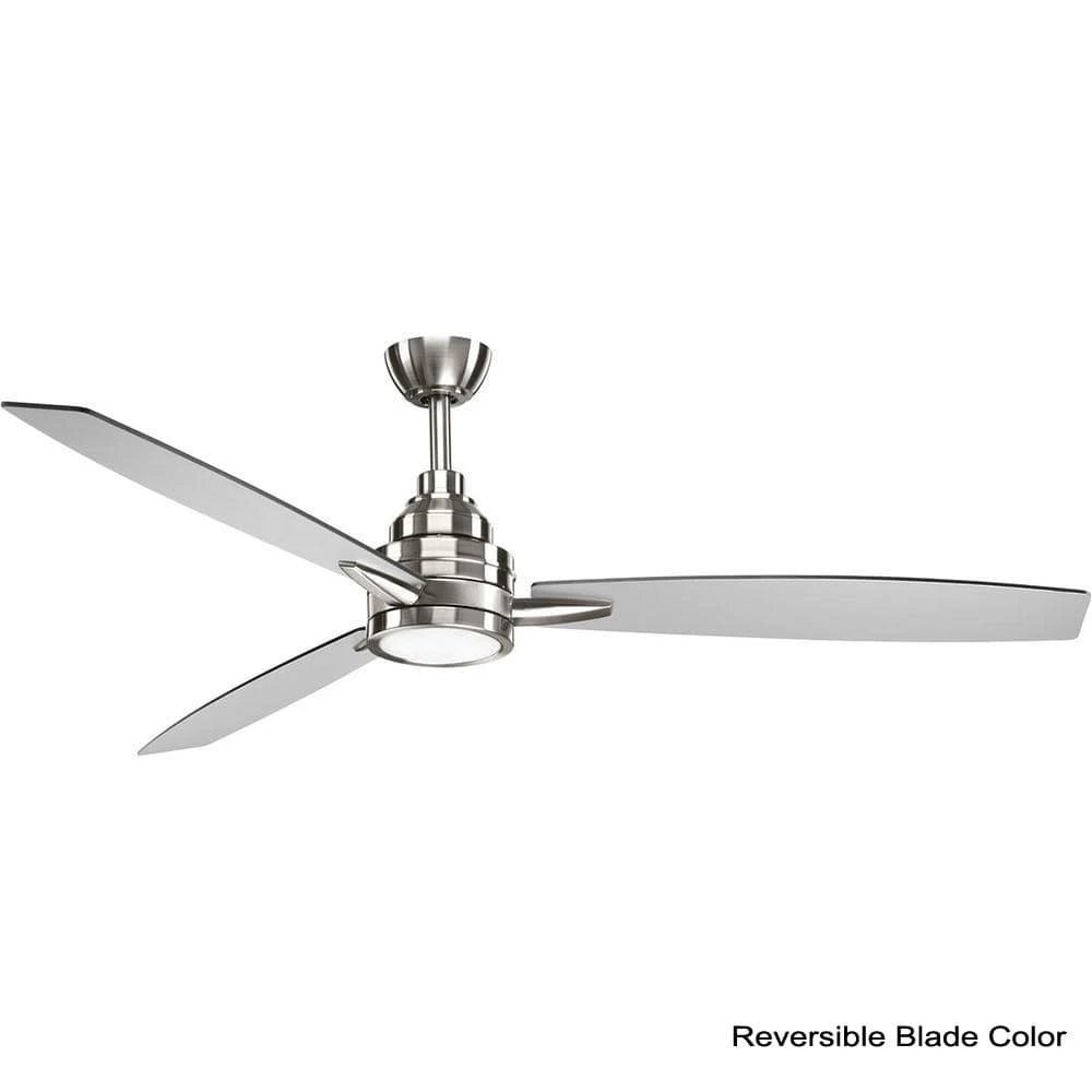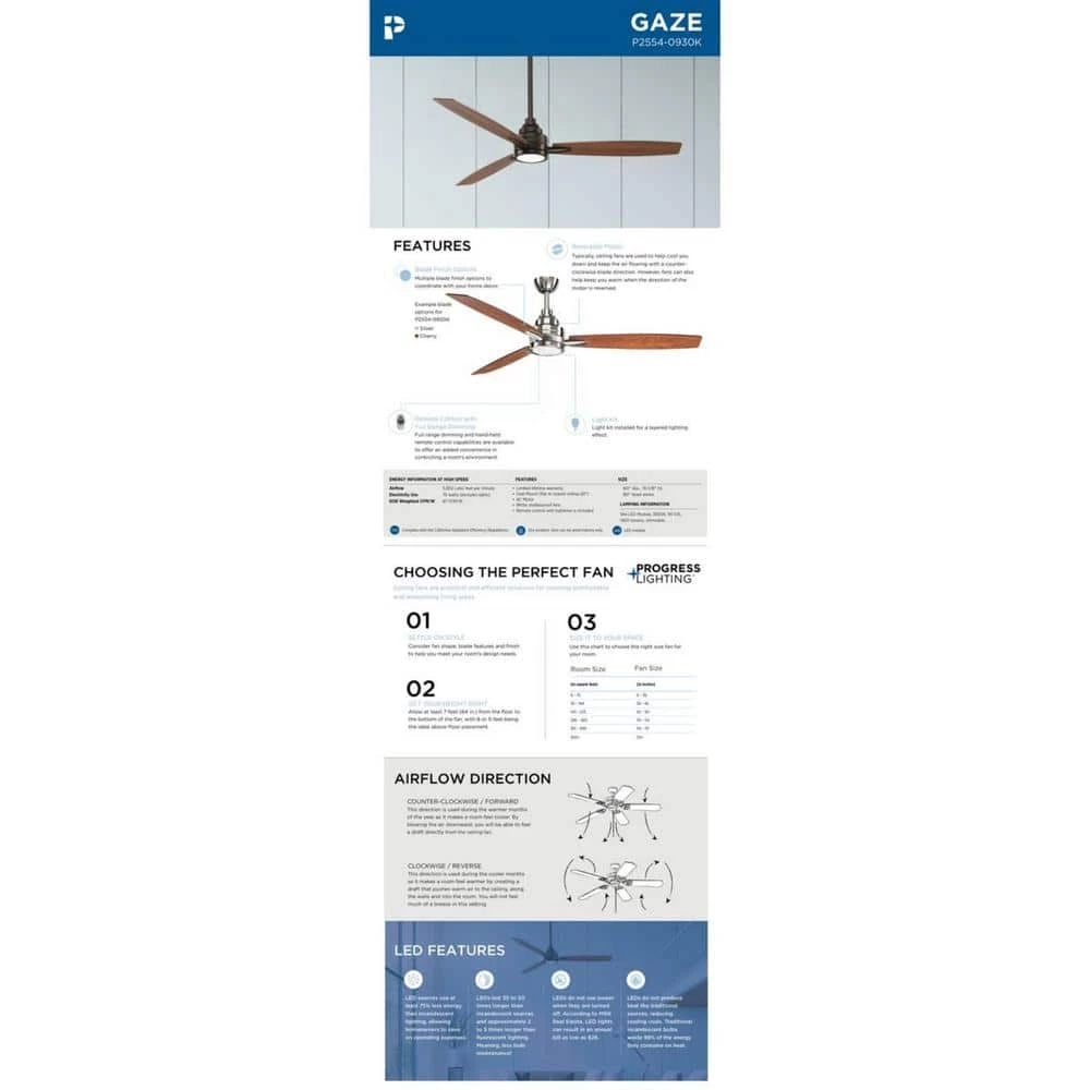 Upgrade your home decor while cooling down your favorite living space with the Gaze Collection 60-Inch LED Three Plywood Blade Ceiling Fan. This ceiling fan features a cutting-edge LED light source that offers both form and function with both energy and cost-saving benefits. A shatter-proof opal white shade covers the LED light source to create gentle ambiance. The fan includes full-range dimming abilities and a remote control with batteries included to customize air flow and illumination. The dual-mount center is coated in a beautiful brushed nickel finish. The fan’s reversible plywood blades are coated in a cherry finish on one side and a silver finish on the other to offer versatility when it comes to finding a place in your home decor vision. For optimal illumination, one LED bulb is included (18w max; 3000K). The ceiling fan is ideal for any great room, bedroom, living room, or bonus room in urban industrial or farmhouse settings. It’s time to breathe new life into the mundane every day with timeless and truly transformative lighting. Make your purchase today to begin your journey to a whole new lighting experience. Progress Lighting products are designed for exceptional quality, reliability, and functionality.