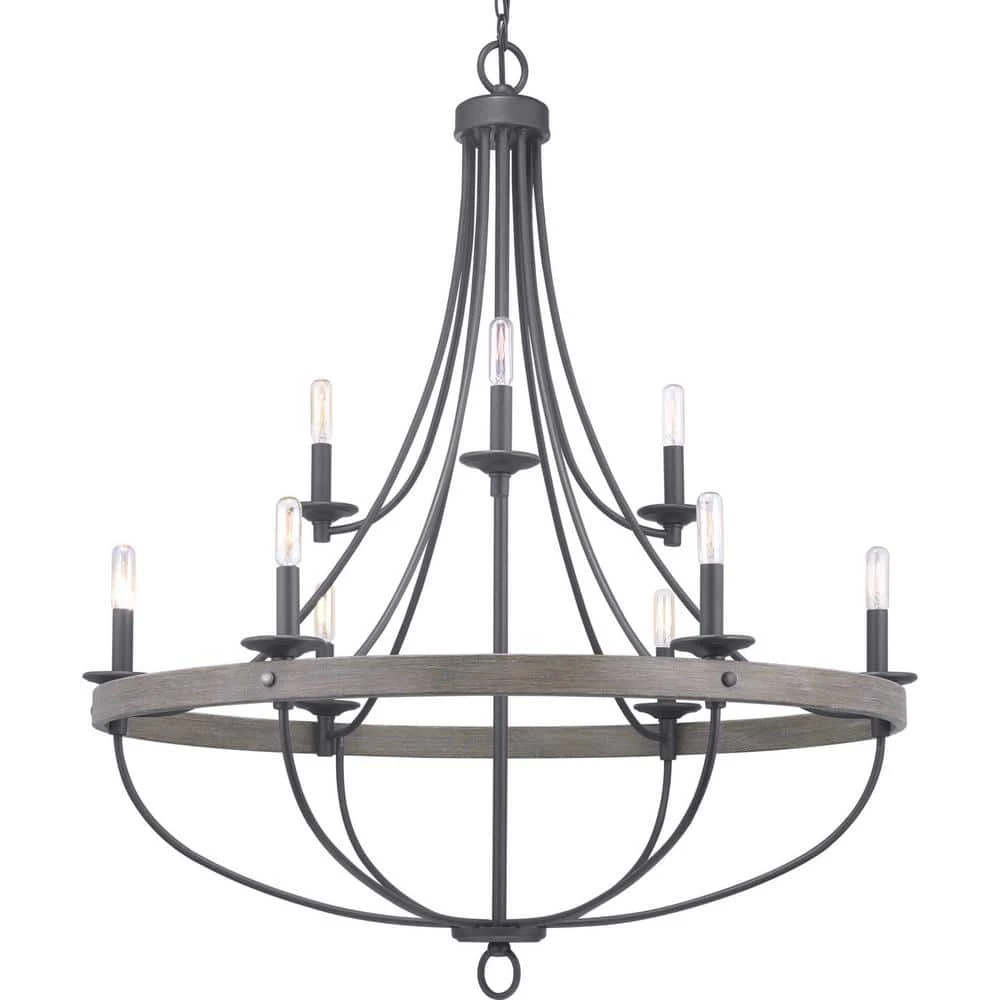 - Distinguished two-tiered nine-light chandelier is ideal for tall foyers, entryways, large dining rooms are vaulted great rooms