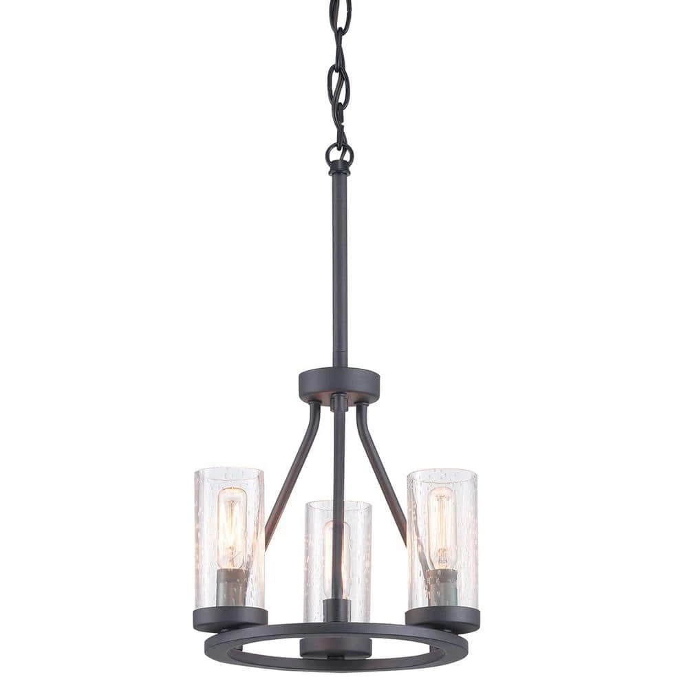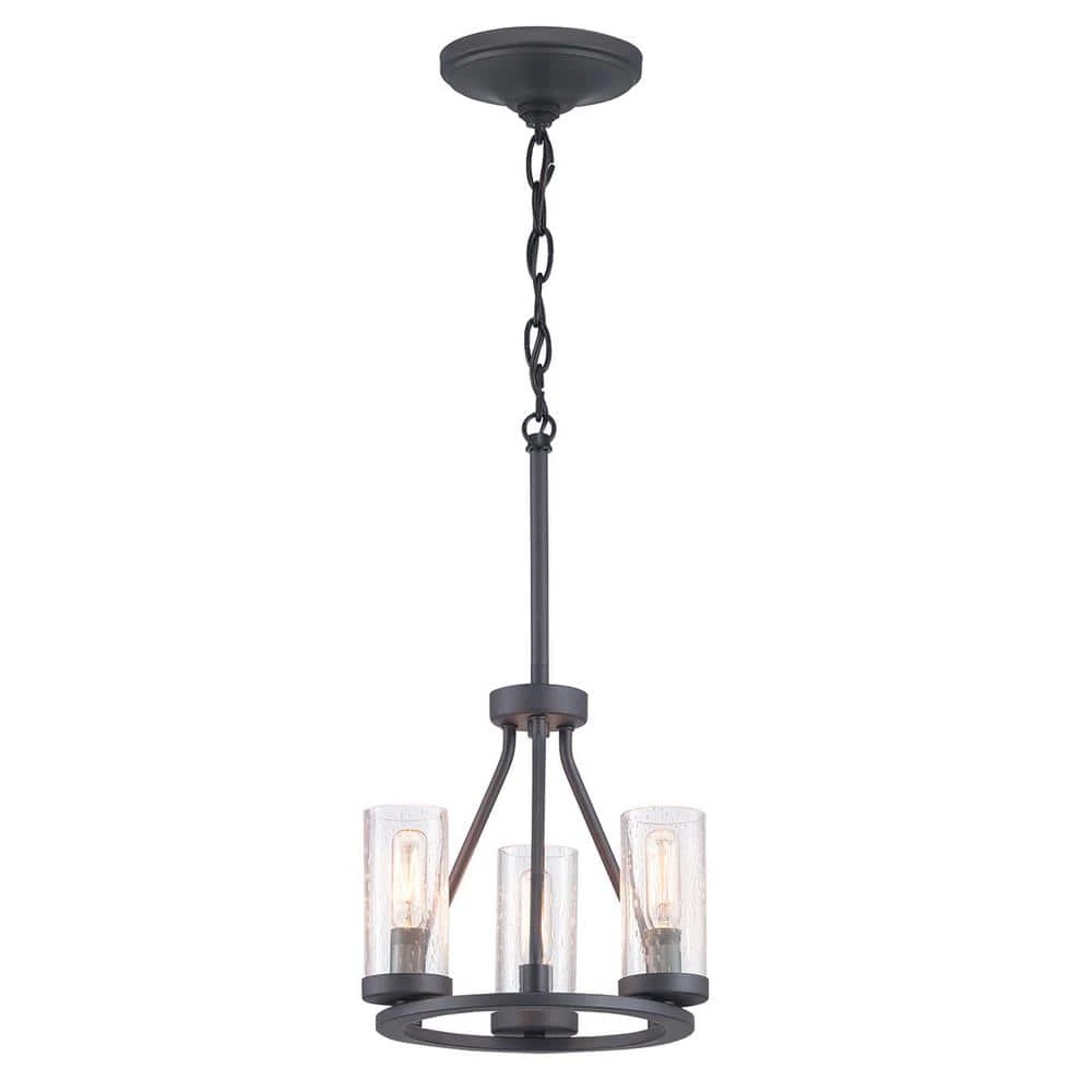 Hartwells statement making design will add a focal point to any space. The Graphite finish with antique nickel accents provides a two-toned element to a circular frame with clear seeded glass shades. Mini-pendants can be displayed singularly or in groupings of two or more in spaces, such as living rooms, dining rooms, foyer areas and master bedroom suites.