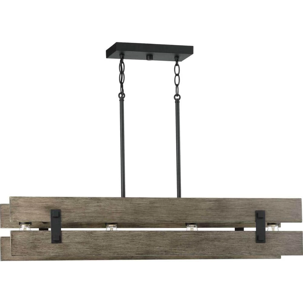 Create an extension of your personality and lifestyle with the rustic charm of this island light. Country character is the cornerstone of this light fixture that features a crate-like frame composed of aged oak. Black barn-inspired metal details complete this must-have farmhouse design.