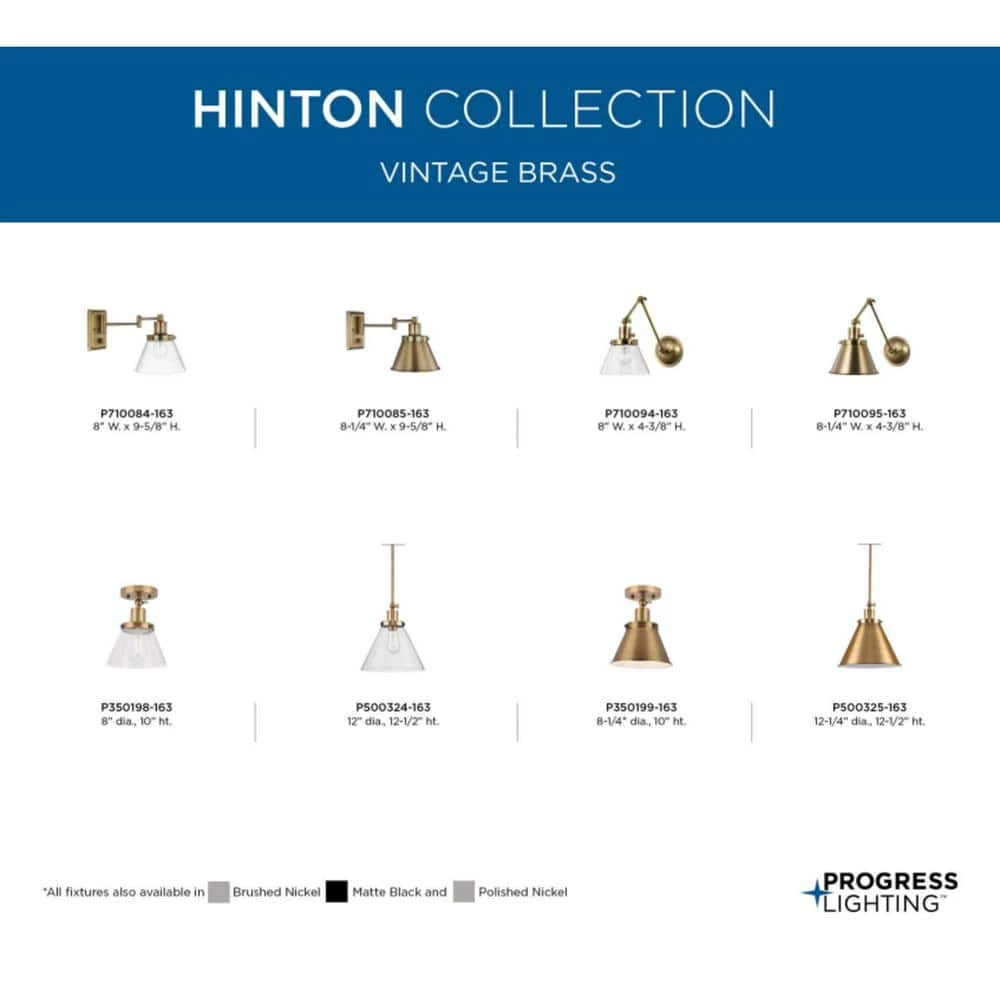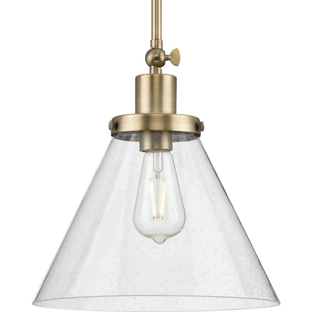 Enjoy focused task lighting with the Hinton Collection 1-Light Seeded Glass Vintage Brass Industrial Pendant Light. A light source glows from within a clear seeded glass shade for focused task light with unexpected visual texture. A vintage light base with round decorative knobs is coated a sleek vintage brass finish for moderndustrial character. The light base attaches to a metal stem that suspends from the ceiling plate. For ideal illumination, use 1 medium base bulb that is sold separately (100-Watt maximum- LED/CFL/incandescent). The hanging light is compatible with dimmable bulbs. Incorporate clear light bulbs for a pinch of contemporary shine or opt for vintage bulbs to enhance the light fixture’s rustic demeanor. The pendant’sdustrial design is ideal for any foyer, dining room, kitchen, breakfast nook, entryway, living room, or bedroom coastal, farmhouse, transitional, or vintage electric style settings. It’s time to breathe new life to the mundane every day with timeless and truly transformative bathroom lighting. Make your purchase today to begin your journey to a whole new lighting experience. Progress Lighting products are designed for exceptional quality, reliability, and functionality.
