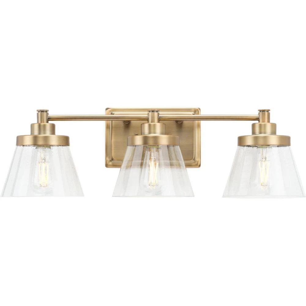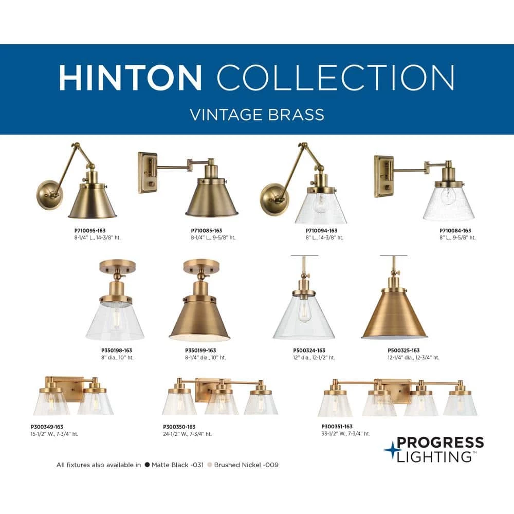Embrace stylish simplicity with the Hinton Collection. The sleek frame and backplate are coated in a golden vintage brass finish. Light sources glow from inside clear seeded glass shades that add an extra-touch of visual texture.