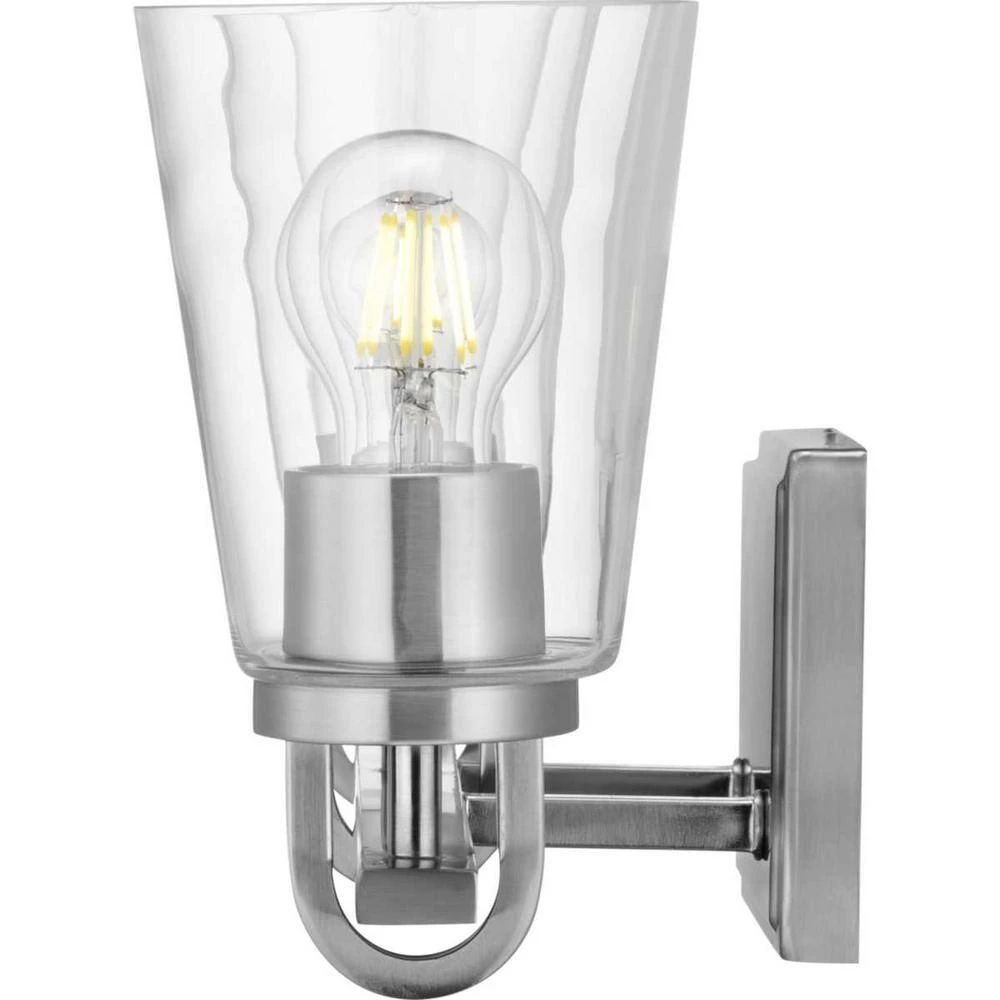 Refine your space with this Huntscroft 7.3 in. 3-Light Brushed Nickel Vanity Light with Clear Glass Shades. Easily mount this in your desired space. It features a brushed nickel finish that pairs with a variety of design schemes.