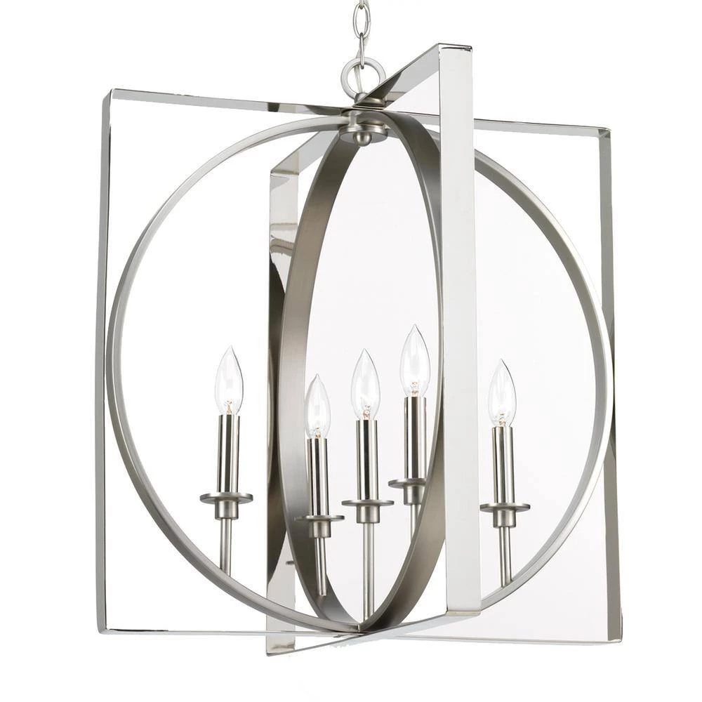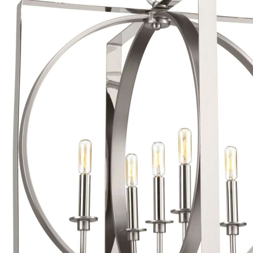 Home accents inspired by geometric elements are popular in today’s homes. This pendant is comprised of a Polished Nickel rectangle frame with a circle accent. This 6-light fixture can be used in lieu of a chandelier – in foyers, over dining room tables or in other open living spaces.