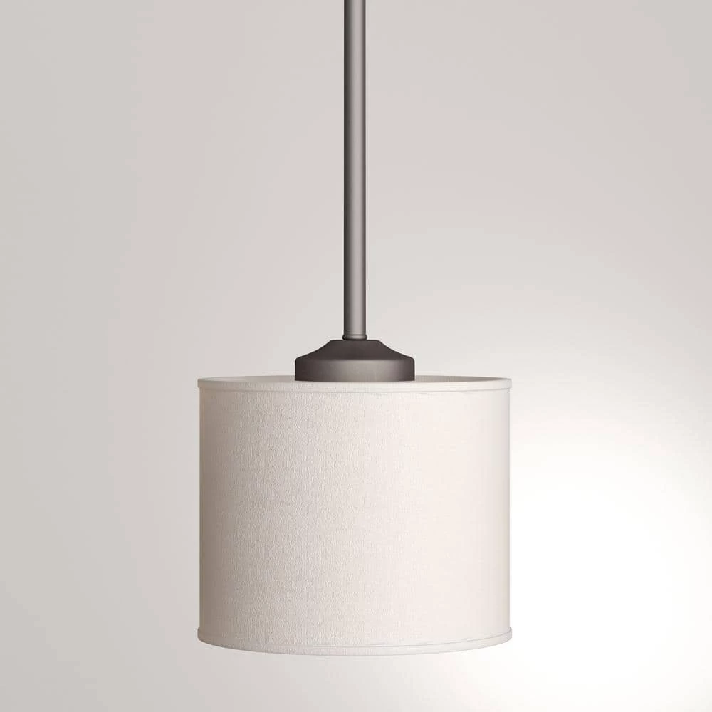 Harkening back to a simpler time, the Inspire Collection freshens traditional forms with flowing lines. An off-white linen shade is supported by a stem that carries the clean line all the way to the ceiling and, for sloped ceilings. A 72 in. chain and two 6in rods are provided in purchase to allow versatility in which install method preferred. Both options allow the fixture to hang straight and level. Pictured in kitchen room scene image are additional 6in rods formed together to extend hanging length. Additional rods can be purchased separately.