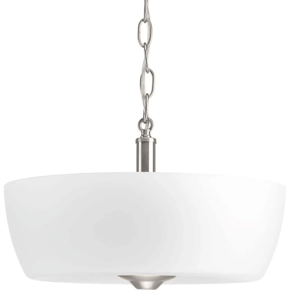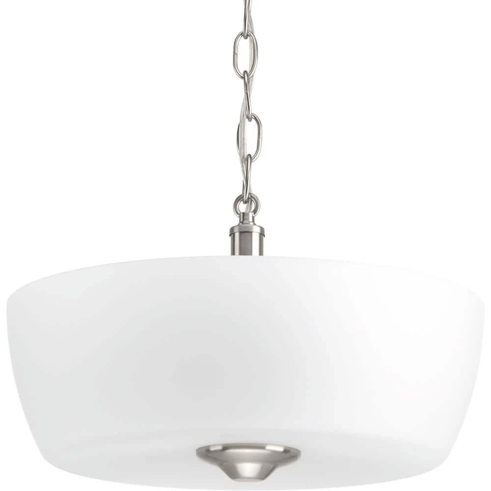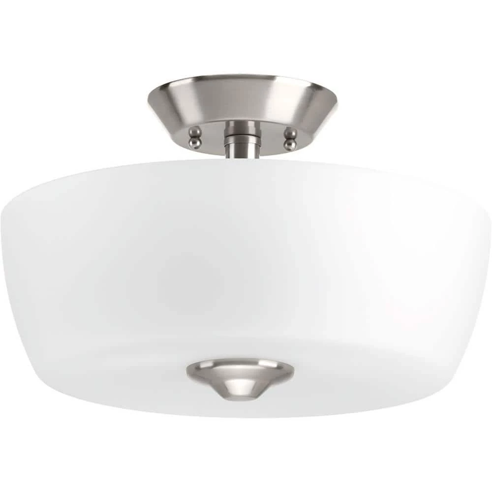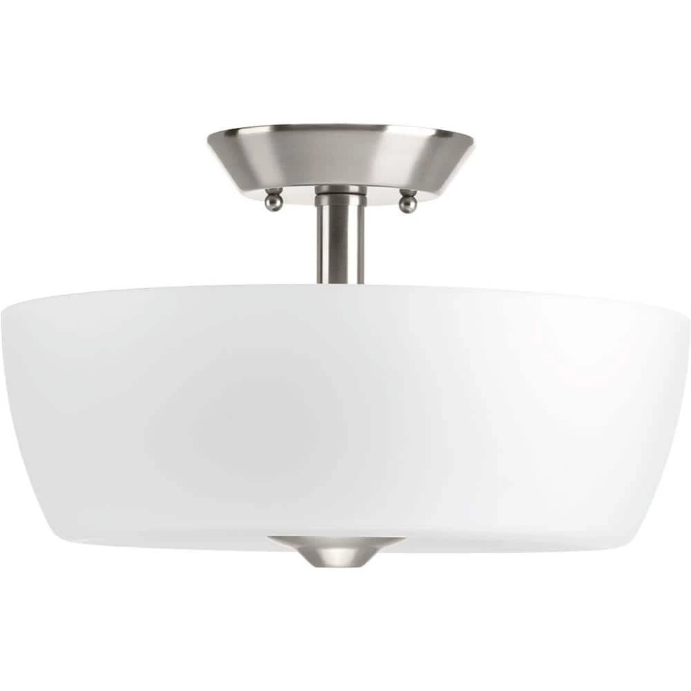 The Leap collection features etched glass shades that are slightly larger in scale to complement contemporary design trends. This two-light semi-flush convertible is finished in Brushed Nickel. Fixture can be chain hung or semi-flush to ceiling.