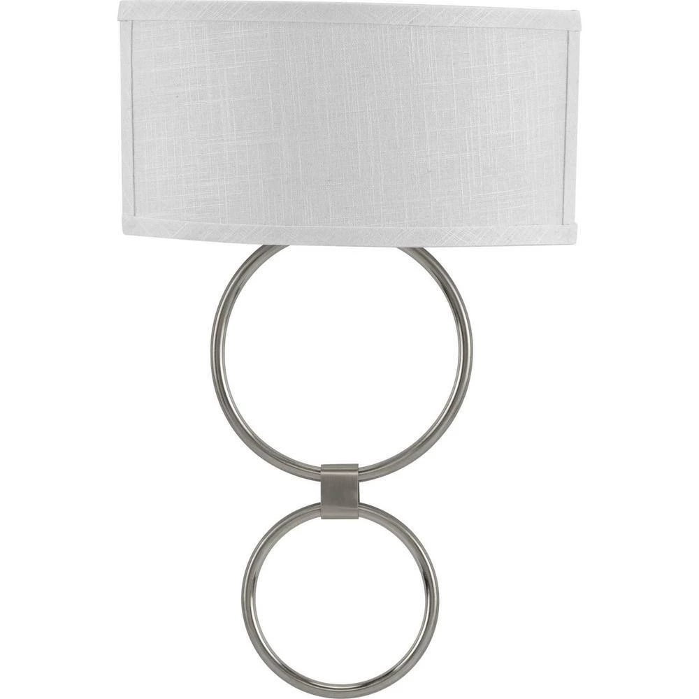 This wall sconce is ideal for corridor and hotel lighting. Circular forms created a stunning brushed nickel frame. The light fixture is topped by a summer linen shade that creates a calming glow sure to welcome tired travelers.