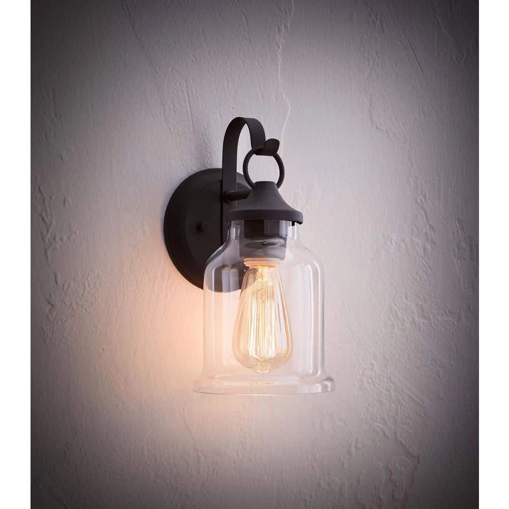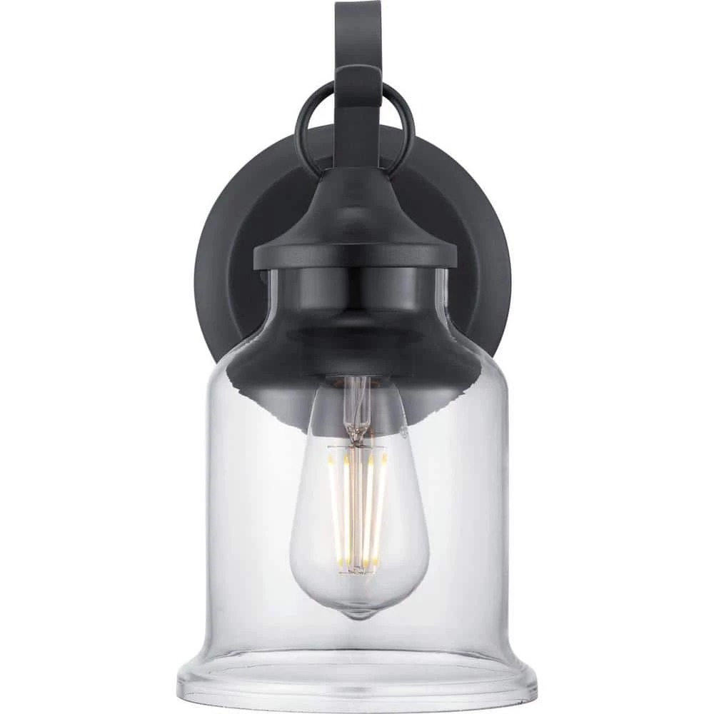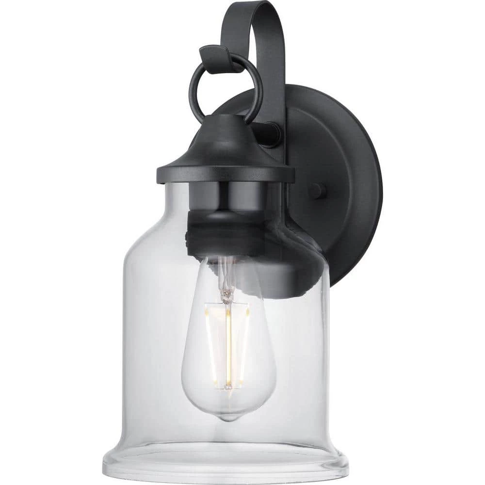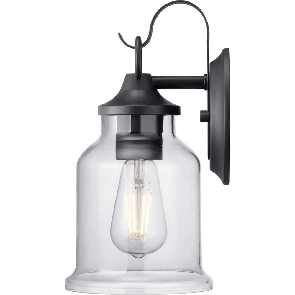 Infuse your home with the vintage charm of the Lindberry Collection One-Light Medium Wall Lantern. An apothecary-inspired clear glass shade encases the light base with a rimmed bottom through which an ambient light can spill out onto a floor or porch. A black vintage light base attaches to a round backplate that makes the versatile design compatible with a variety of exteriors and interiors.