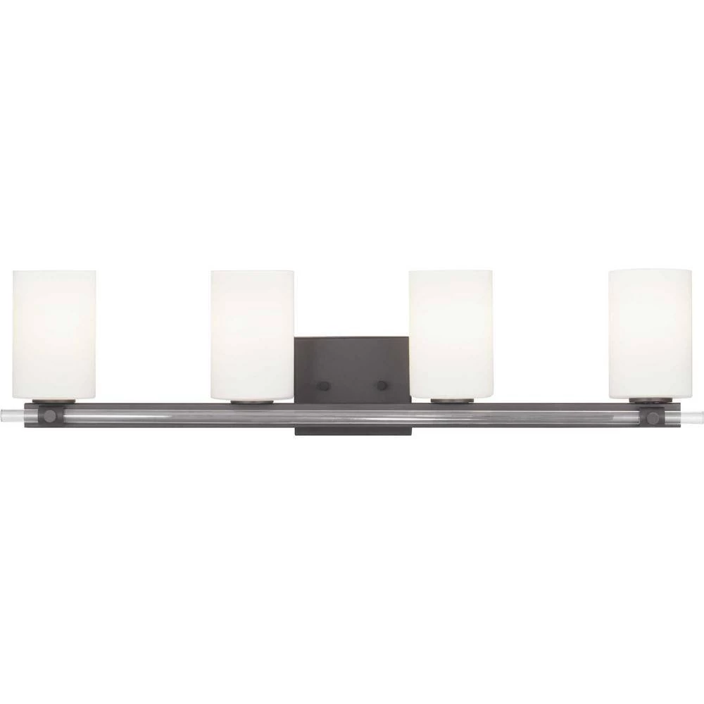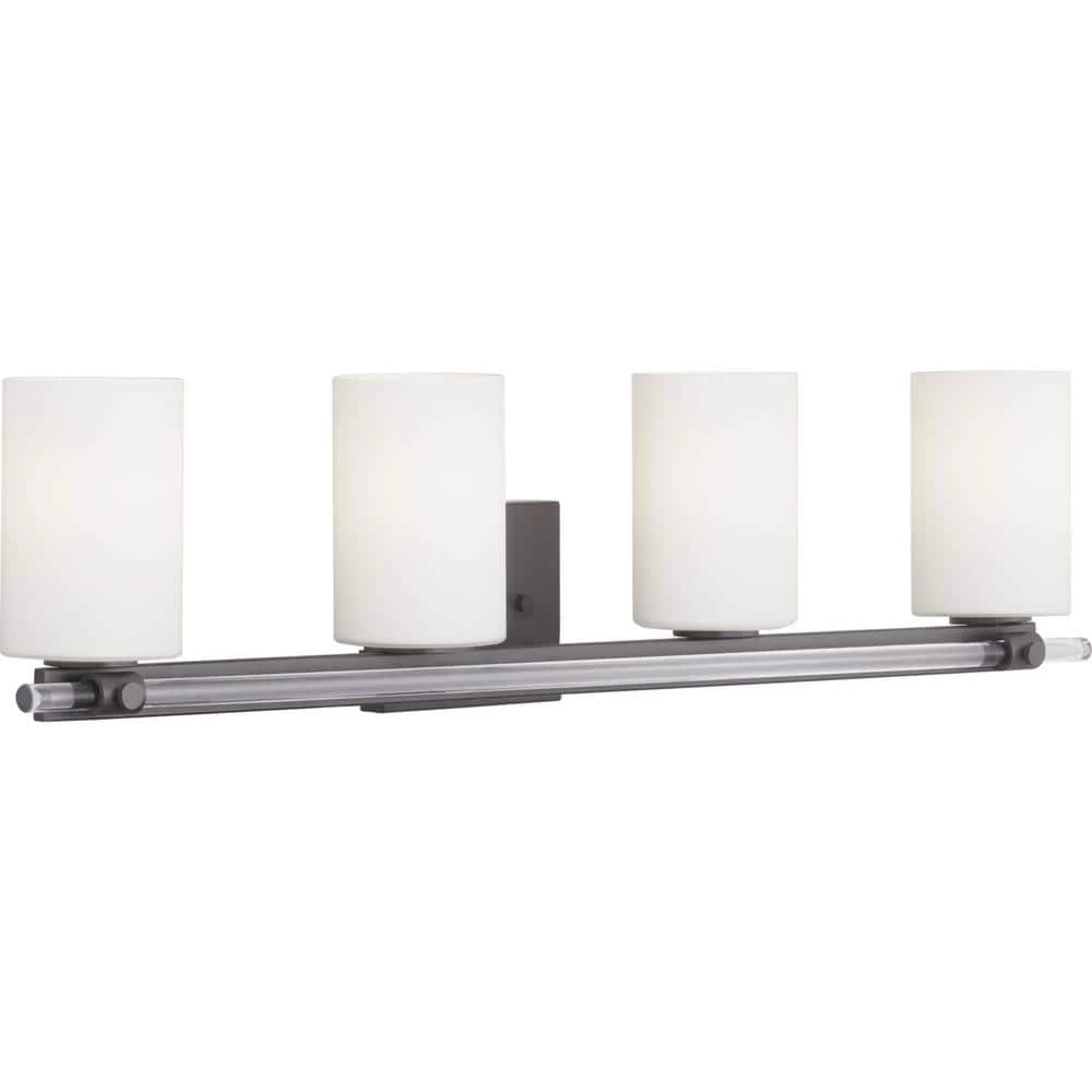 - Etched opal glass shades complement the metallic base of this 4-light bath sconce