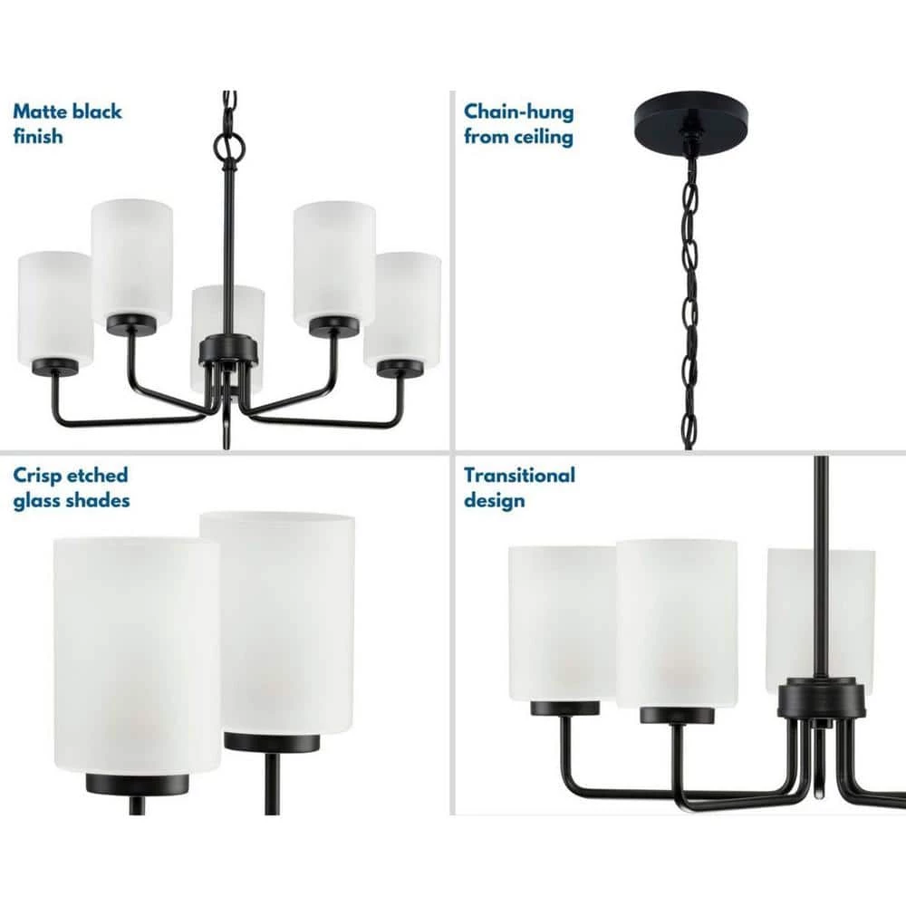 - Incorporate a clean, contemporary design with the Merry Collection 5-light etched glass matte black transitional chandelier light is ideal for any foyer, dining room, kitchen, bedroom, or living room