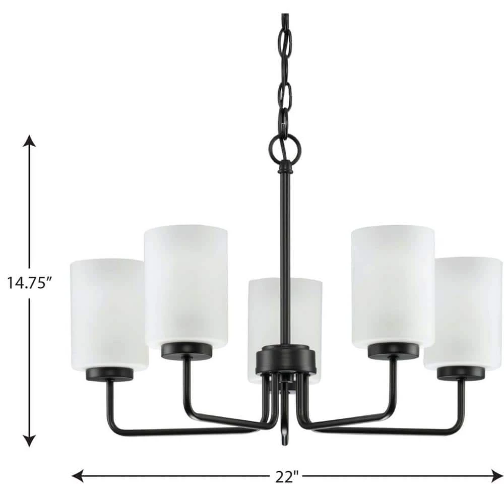 Light sources glow from within crisp etched glass shades for a generous elegant glow sure to transform your favorite living space to a modern retreat. The clean-lined tubular frame is coated a beautiful matte black finish that perfectly blends transitional and modern character. For ideal illumination, use 5 medium base bulbs that are sold separately (100-Watt maximum- LED/CFL/incandescent). The chandelier is compatible with dimmable bulbs. The chandelier’s contemporary design is ideal for any foyer, dining room, kitchen, bedroom, or living room modern and transitional style settings. It’s time to breathe new life to the mundane every day with timeless and truly transformative lighting. Make your purchase today to begin your journey to a whole new lighting experience. Progress Lighting products are designed for exceptional quality, reliability, and functionality.