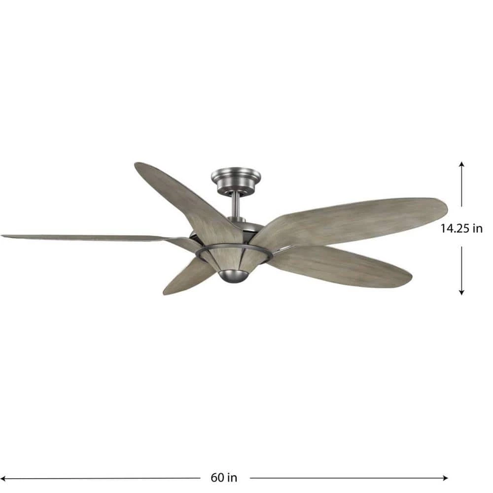 Combine form and function with a 60 in. urban/industrial ceiling fan from the Mesilla Collection. 5 expansive ABS blades crafted with a gorgeous white barnwood finish rotate around an antique nickel center. A 6-speed handheld remote is included. Not light kit compatible.