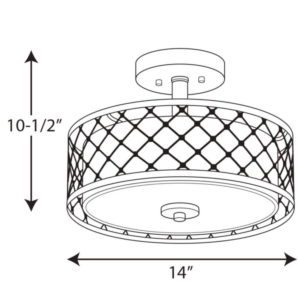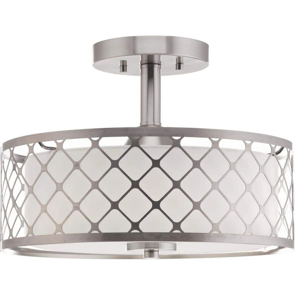 One-light LED semi-flush mount features a modern square pattern in a Brushed Nickel metal shade that surrounds a summer linen fabric shade with a glass diffuser. 3000K, 90+ CRI 1,211 Lumens 71.2 lumen/watt. A versatile fixture that can be used in many lighting applications.
