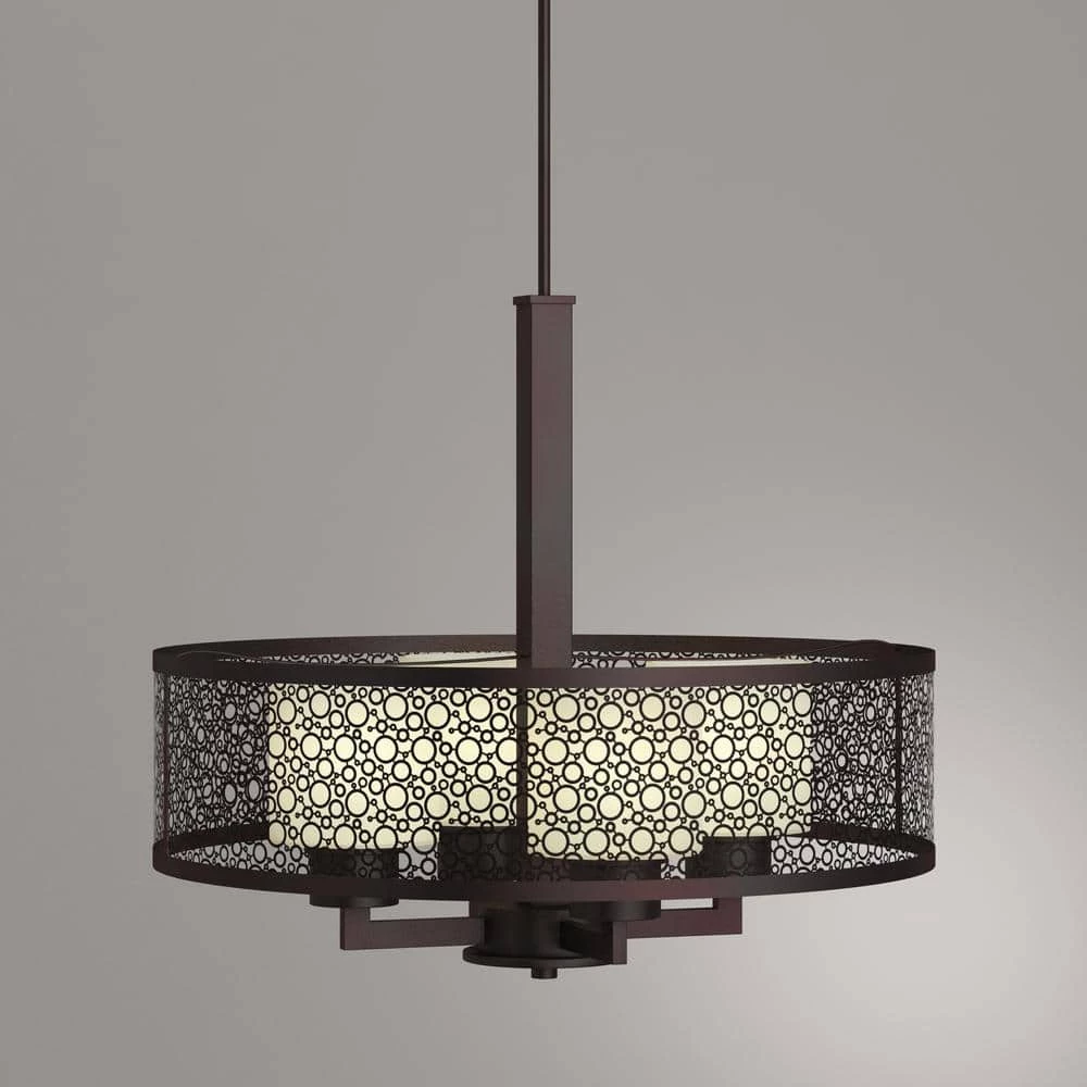 Go ahead. Mingle with your favorite home decor accents to find a place for this fun, flirty fixture. Subtle, parchment-like glass shades offer a discreet pattern and refreshing look when illuminated. A decorative metal frame that highlights alternating concentric, circular shapes surrounds all fixtures. The Antique Bronze finish features a tinted diffuser to complement the warmer fixture. A Brushed Nickel finish option is also available, which provides a nice, softly patterned diffused light for a variety of room settings.