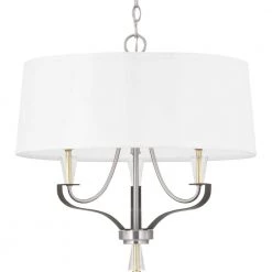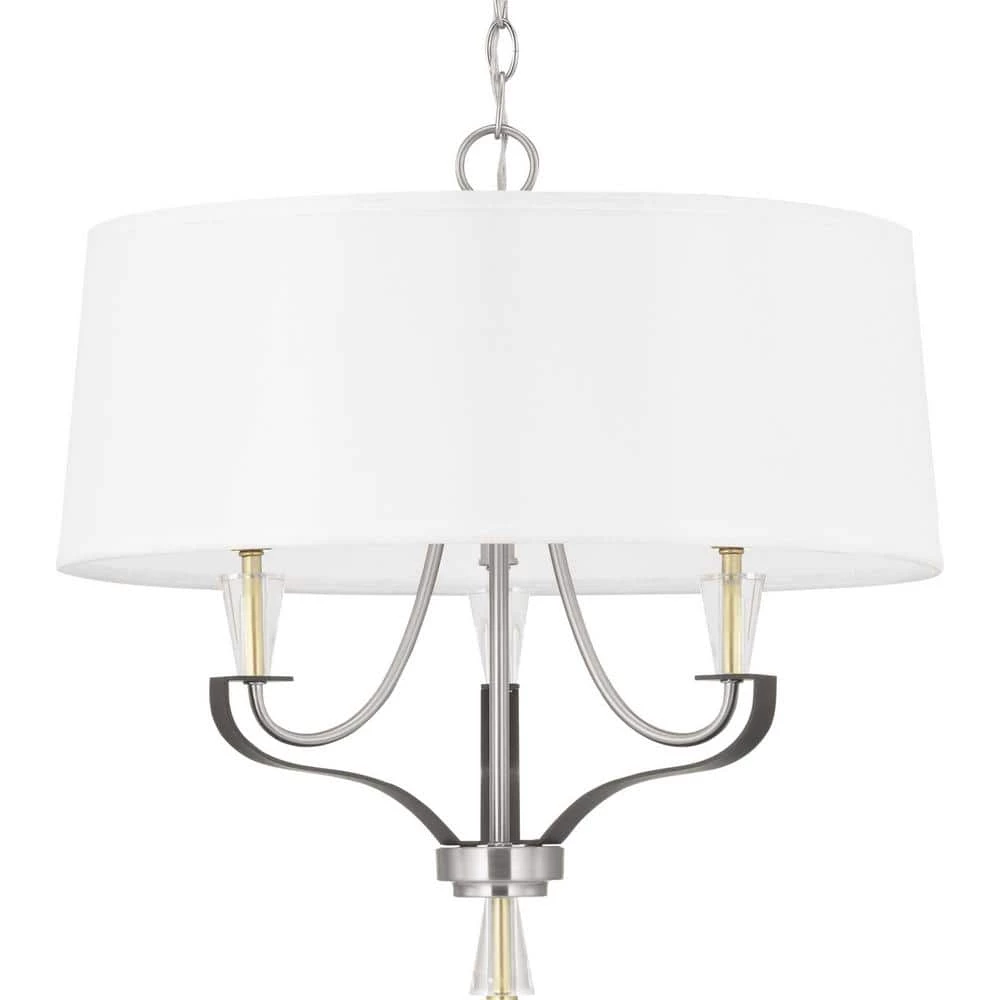 The Nealy Collection three-light chandelier offers classic charm with an edge of modern luxury. Curving details are complemented by a luxurious white silk drum shade. Featuring mixed metal influences, the Brushed Nickel frame is accentuated with Graphite straps and completed with K9 glass over brass-tone candle holders.