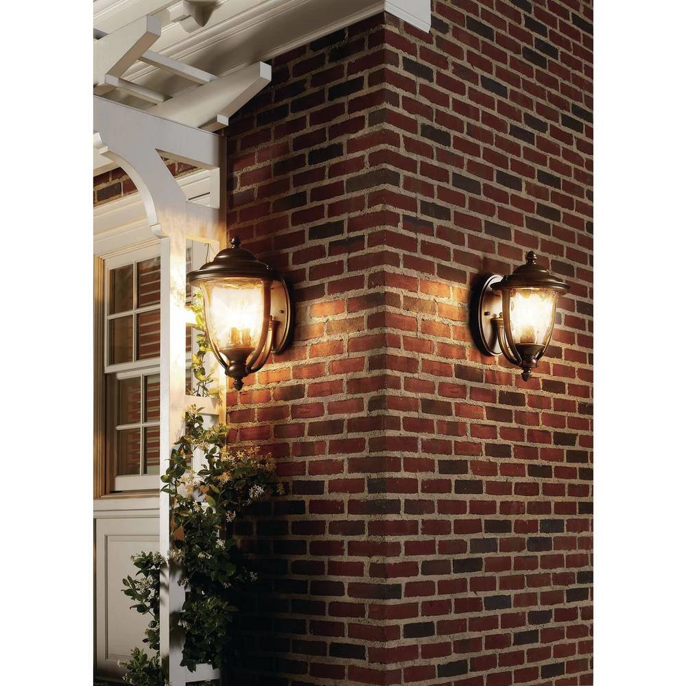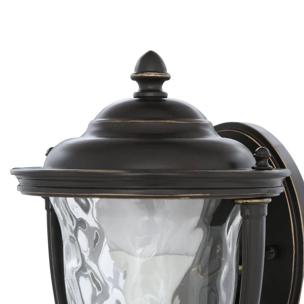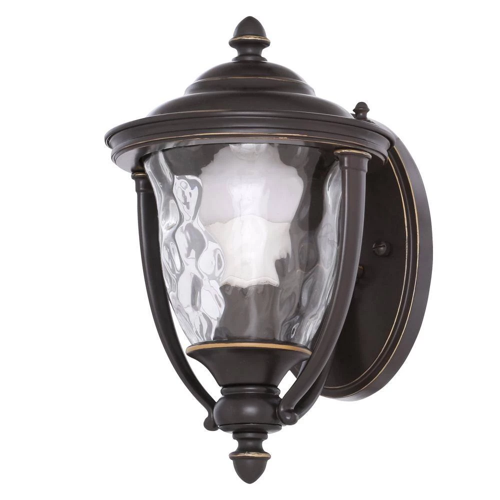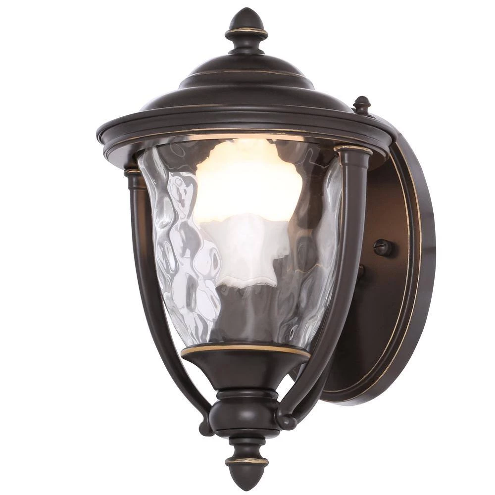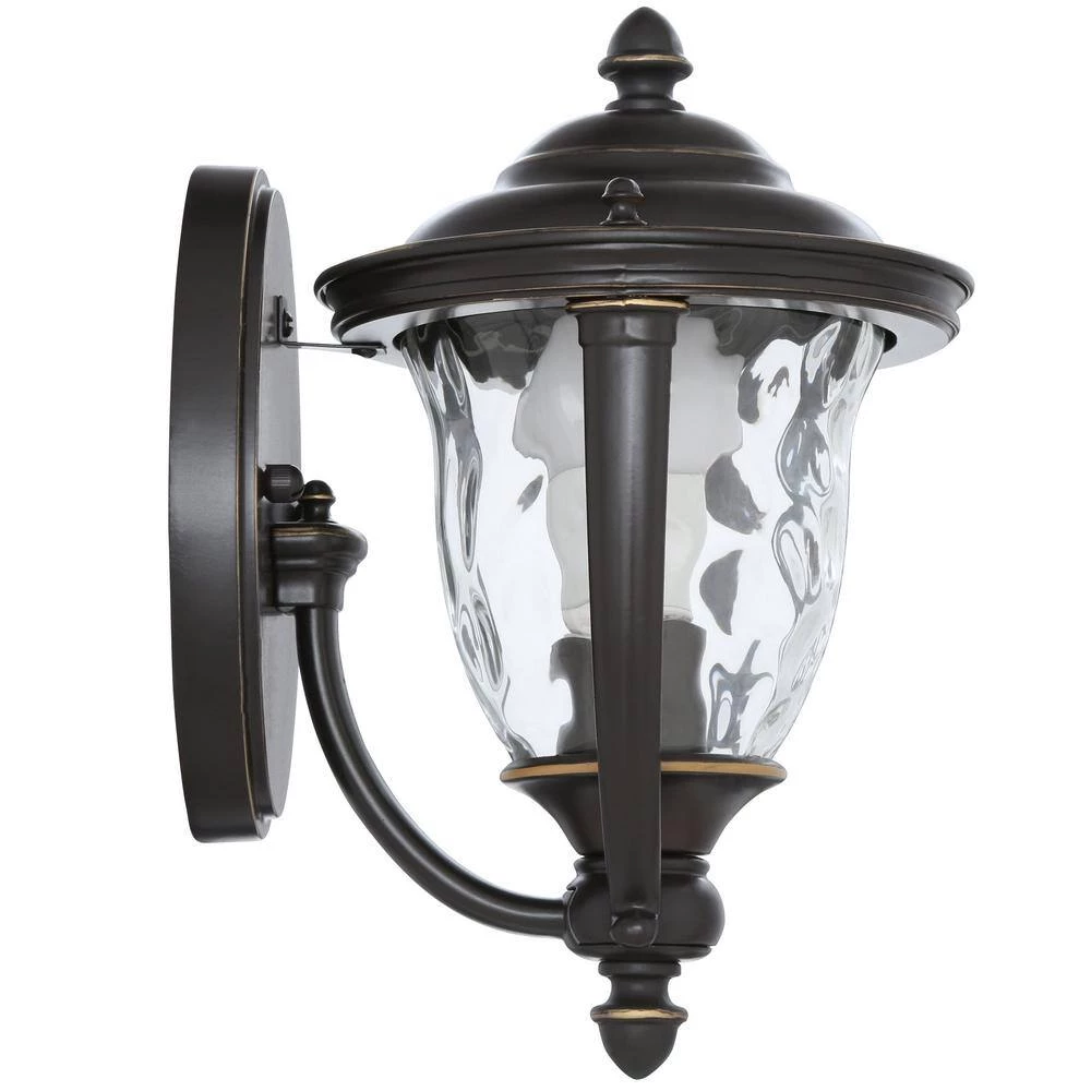 Featuring a stylish and functional design, the Prestwick Collection 1-Light Oil-Rubbed Bronze Outdoor Wall Lantern is finely crafted from durable aluminum for years of reliable service. The yoke design cradles an urn-shaped water-glass shade for sparkling illumination and a rich, hand-painted finish provides an artistic touch for a distinct look in your home. It uses one 100-watt, maximum medium-base incandescent bulb (sold separately) to pleasantly illuminate exterior expanses such as porches, decks, patios, terraces, columns, facades and driveways.