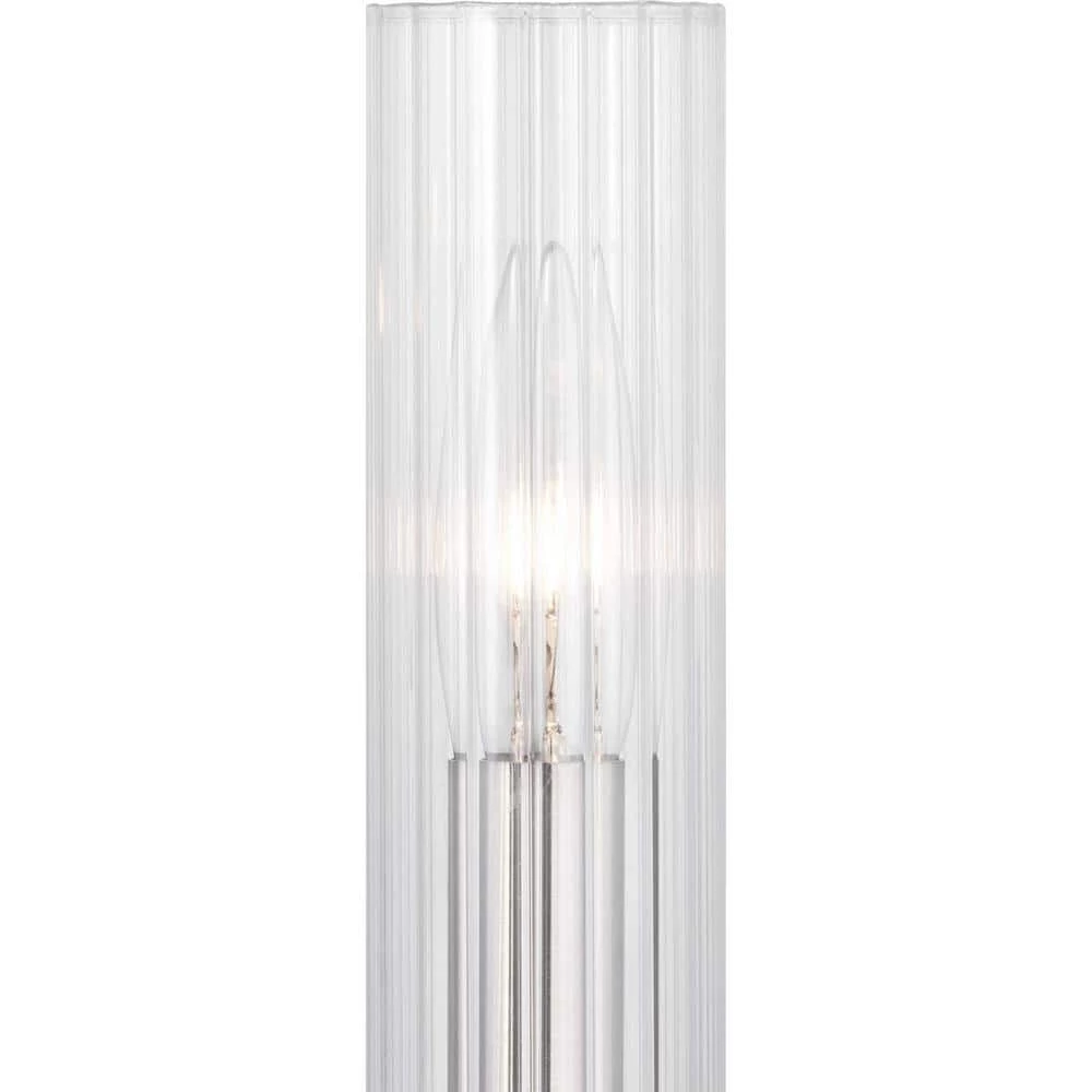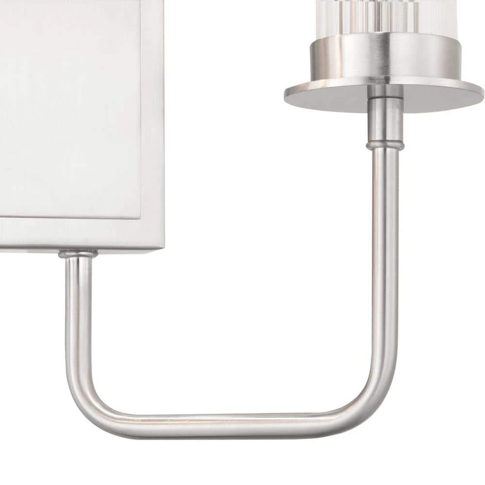 The Rainey Collection two-light wall bracket embraces an artful display of asymmetrical design styling. A slender, staggered frame representing organic forms draws the eye upward to admire the clear fluted ribbed glass shades. The larger scale is suitable for open floor plans, great rooms or anywhere a dramatic focal piece is needed to make a bold statement.