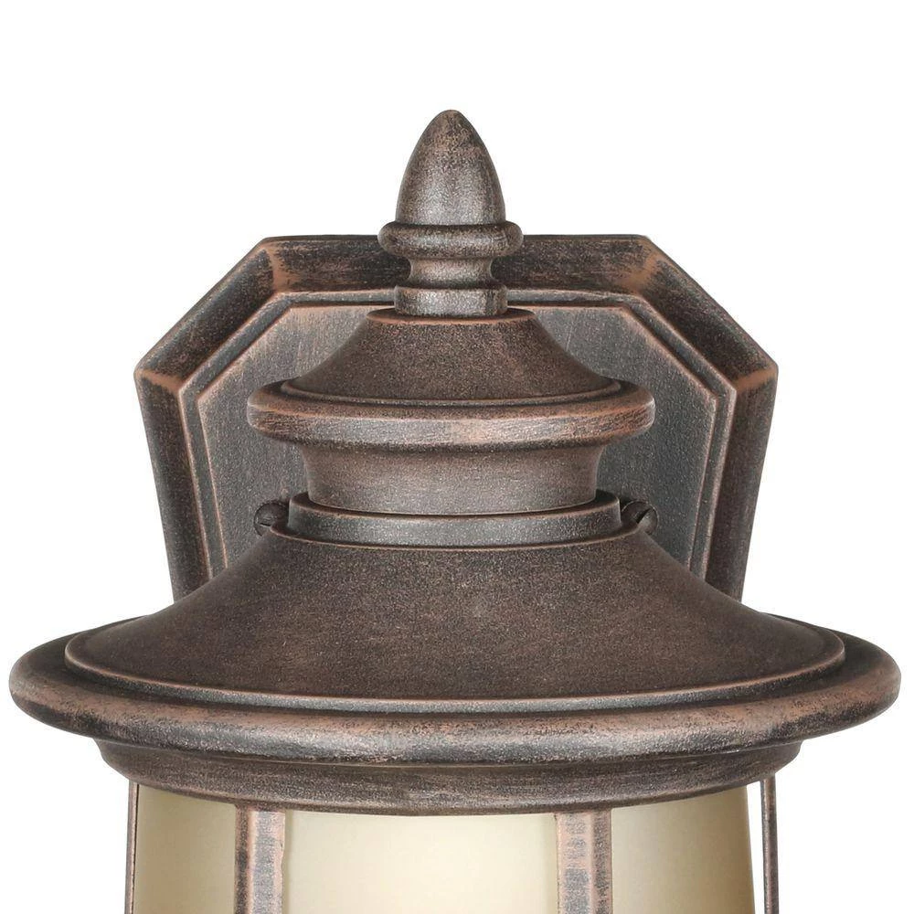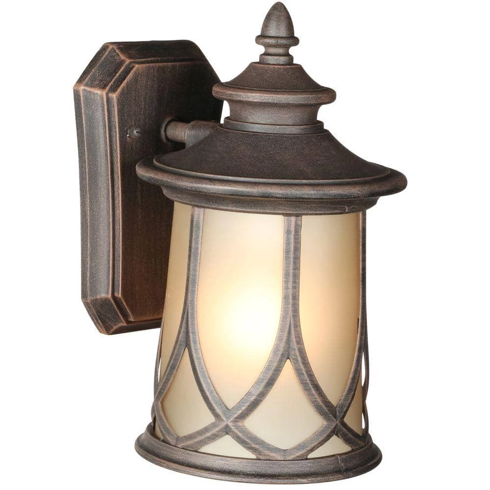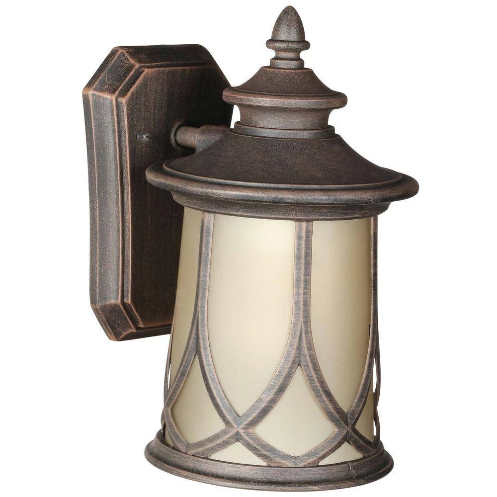 Resort features durable die-cast aluminum housing with lovely lattice work encircling umber tinted glass. The frosted glass diffuser is a great option for both traditional light bulbs and newer energy efficient light sources. Open bottom design allows for easy access to change bulb.