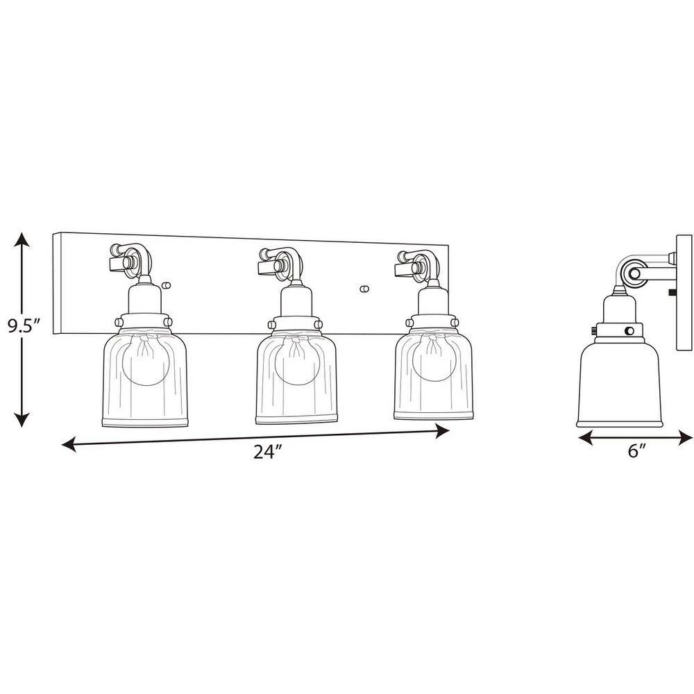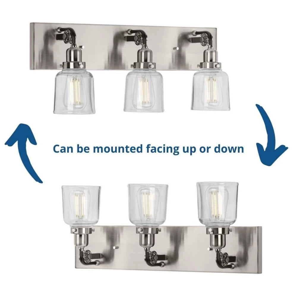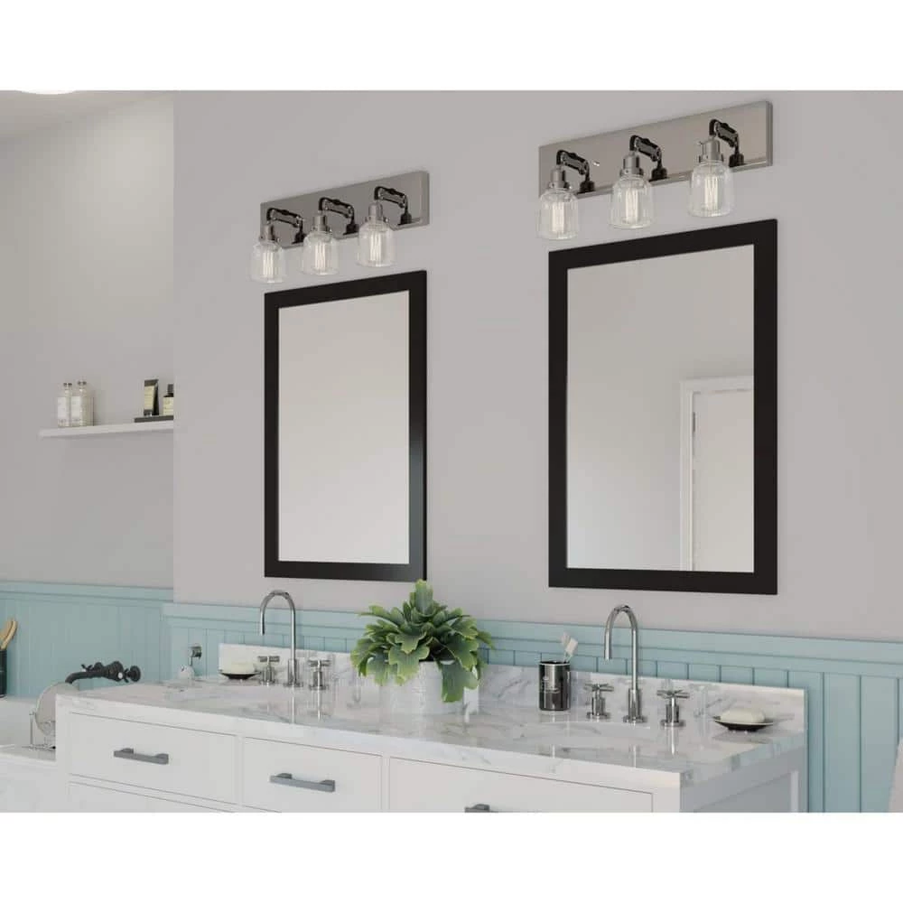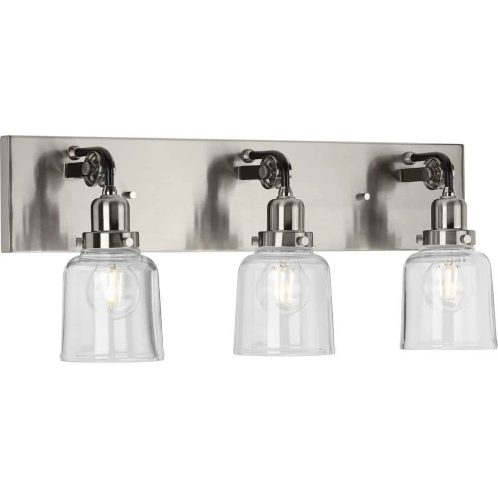 The gorgeous, versatile Rushton 3-light bath will feel at home illuminating a bathroom or wall in any industrial and farmhouse setting. A terrific trio of exposed bulbs shine from inside the classic cover of clear glass shades anchored by antique-style sockets. Each bulb dangles from a Black tube arm that stylishly wraps around a mechanical pulley wheel attached to a rectangular, Brushed Nickel backplate for an added pinch of historical elegance.