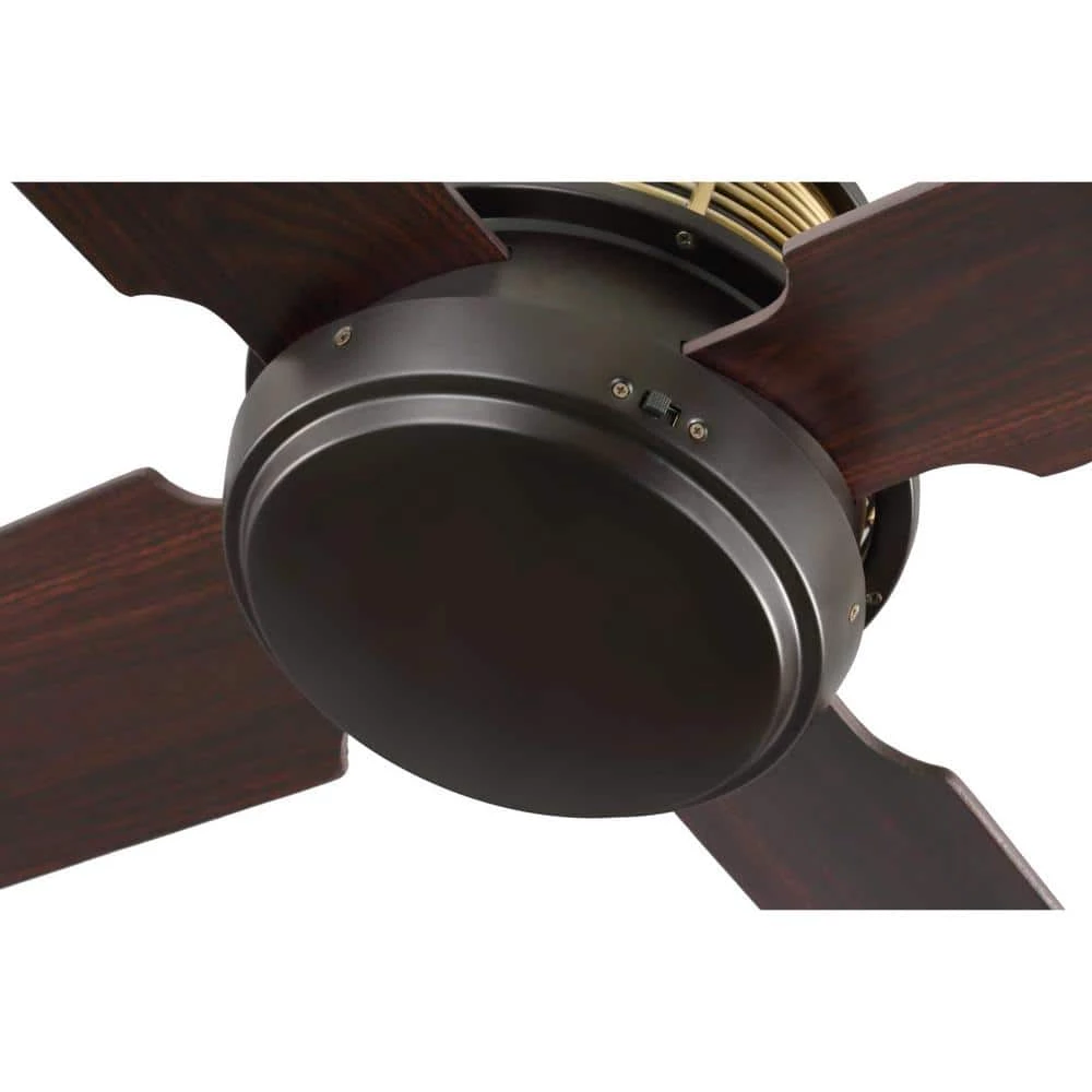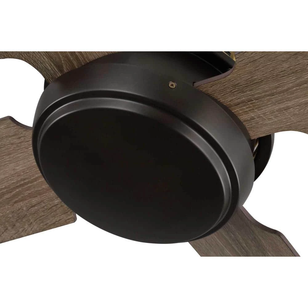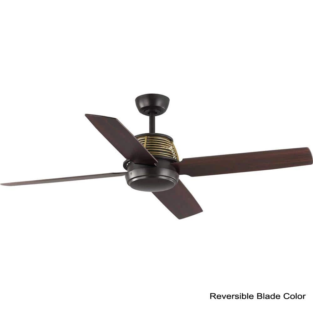 The 56 in. Schaffer four-blade ceiling fan blends a streamlined design with mixed metal elements and a wire mesh housing, suitable for modern and urban industrial spaces. The Architectural Bronze ceiling comes with brushed bronze accents. A remote control with batteries is included.