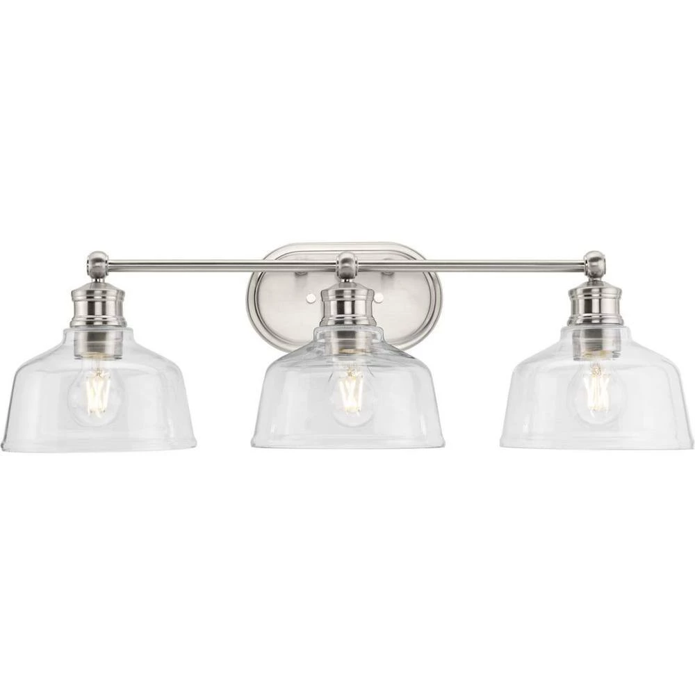 The Singleton Collection 3-light vanity fixture pays homage to industrial styling with oversized warehouse shades fabricated from clear glass. A round backplate and vintage-inspired metal fittings finished in subtle brushed nickel create a timeless design. Place above the vanity mirror for optimal task lighting in the bath. This versatile vanity light can be mounted up or down, casting even illumination in any setting.