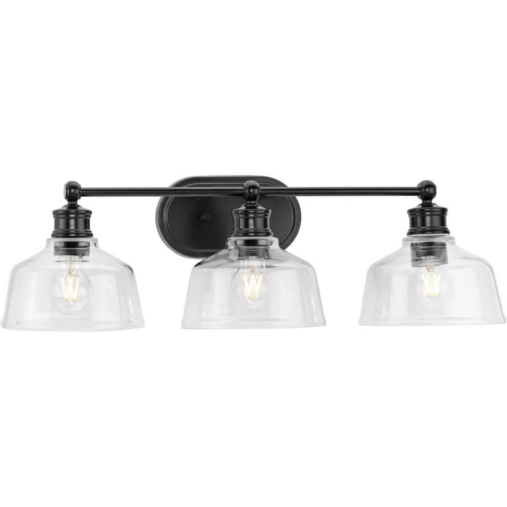 The Singleton Collection 3-light vanity fixture pays homage to industrial styling with oversized warehouse shades fabricated from clear glass. A round backplate and vintage-inspired metal fittings finished in classic matte black create a timeless design. Place above the vanity mirror for optimal task lighting in the bath. This versatile vanity light can be mounted up or down, casting even illumination in any setting.