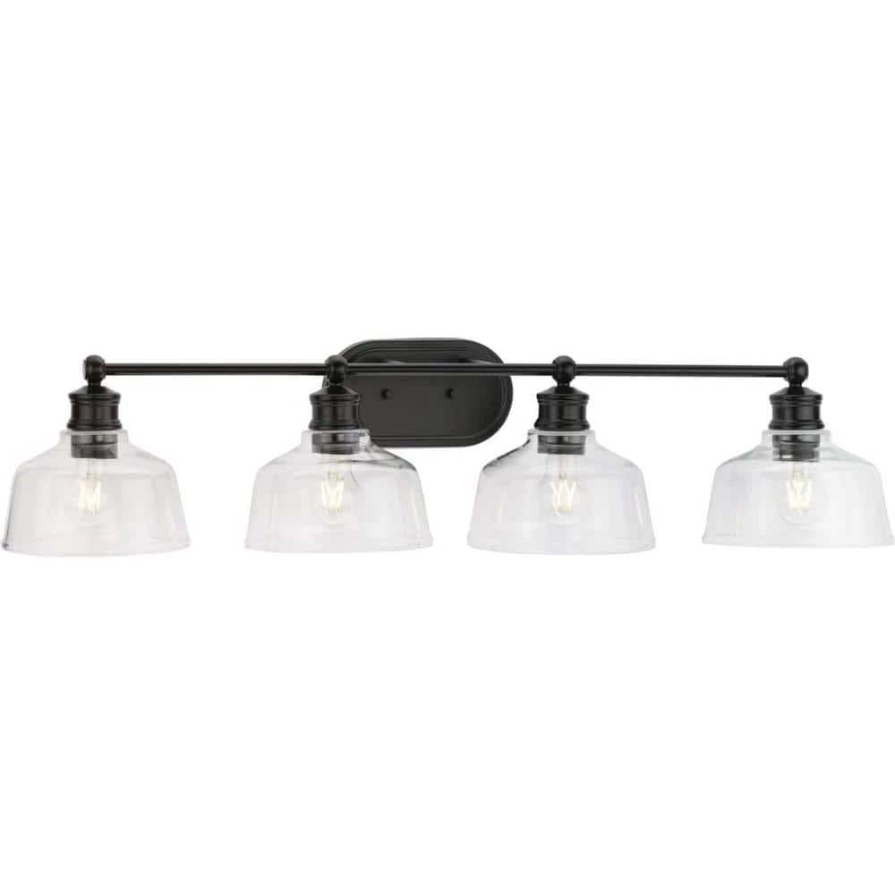 The Singleton Collection 4-light vanity fixture pays homage to industrial styling with oversized warehouse shades fabricated from clear glass. A round backplate and vintage-inspired metal fittings finished in classic matte black create a timeless design. Place above the vanity mirror for optimal task lighting in the bath. This versatile vanity light can be mounted up or down, casting even illumination in any setting.