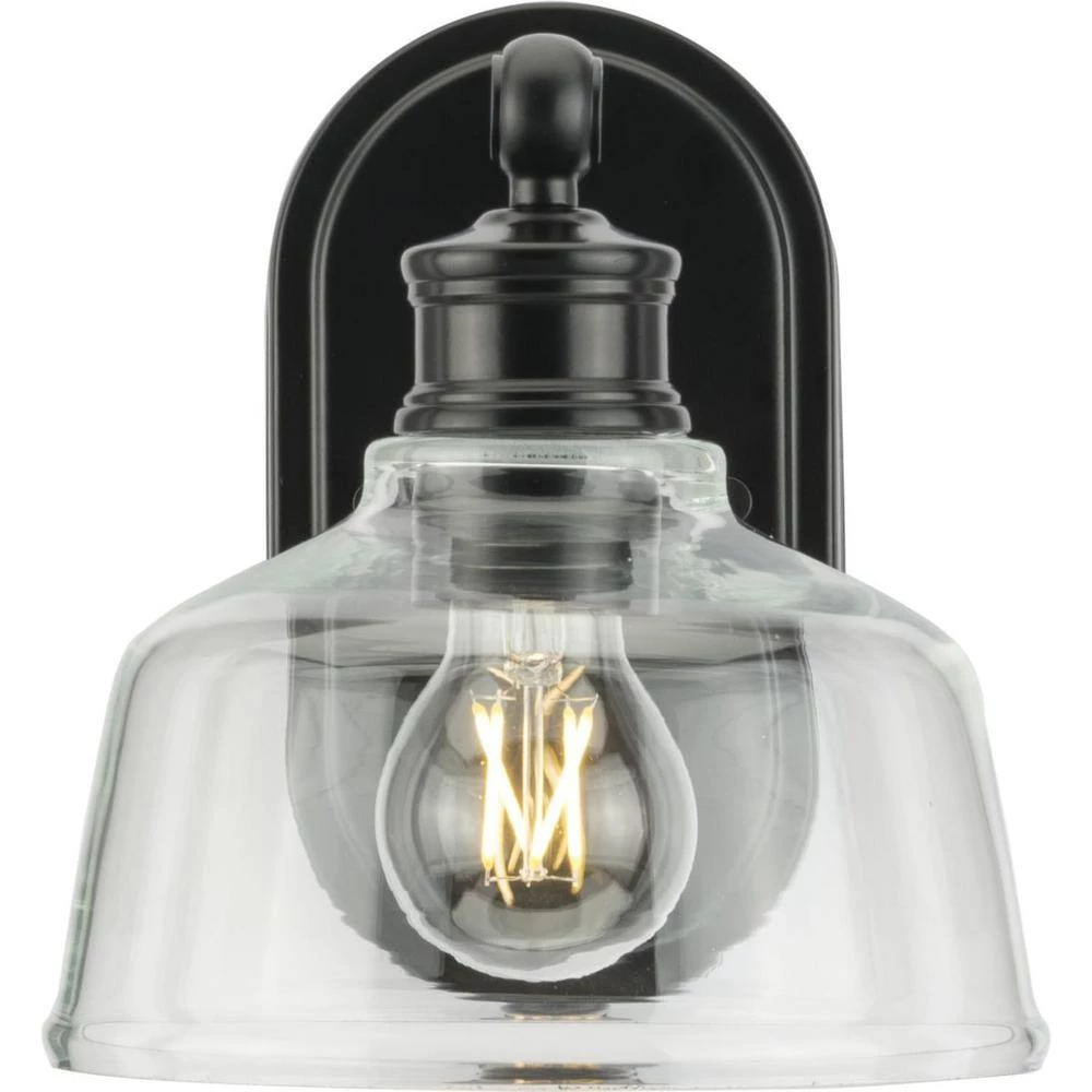 The Singleton Collection 1-light vanity fixture pays homage to industrial styling with an oversized warehouse shade fabricated from clear glass. A round backplate and vintage-inspired metal fittings finished in classic matte black create a timeless design. Place one on either side of the vanity mirror for optimal task lighting in the bath. This versatile vanity light can be mounted up or down, casting even illumination in any setting.