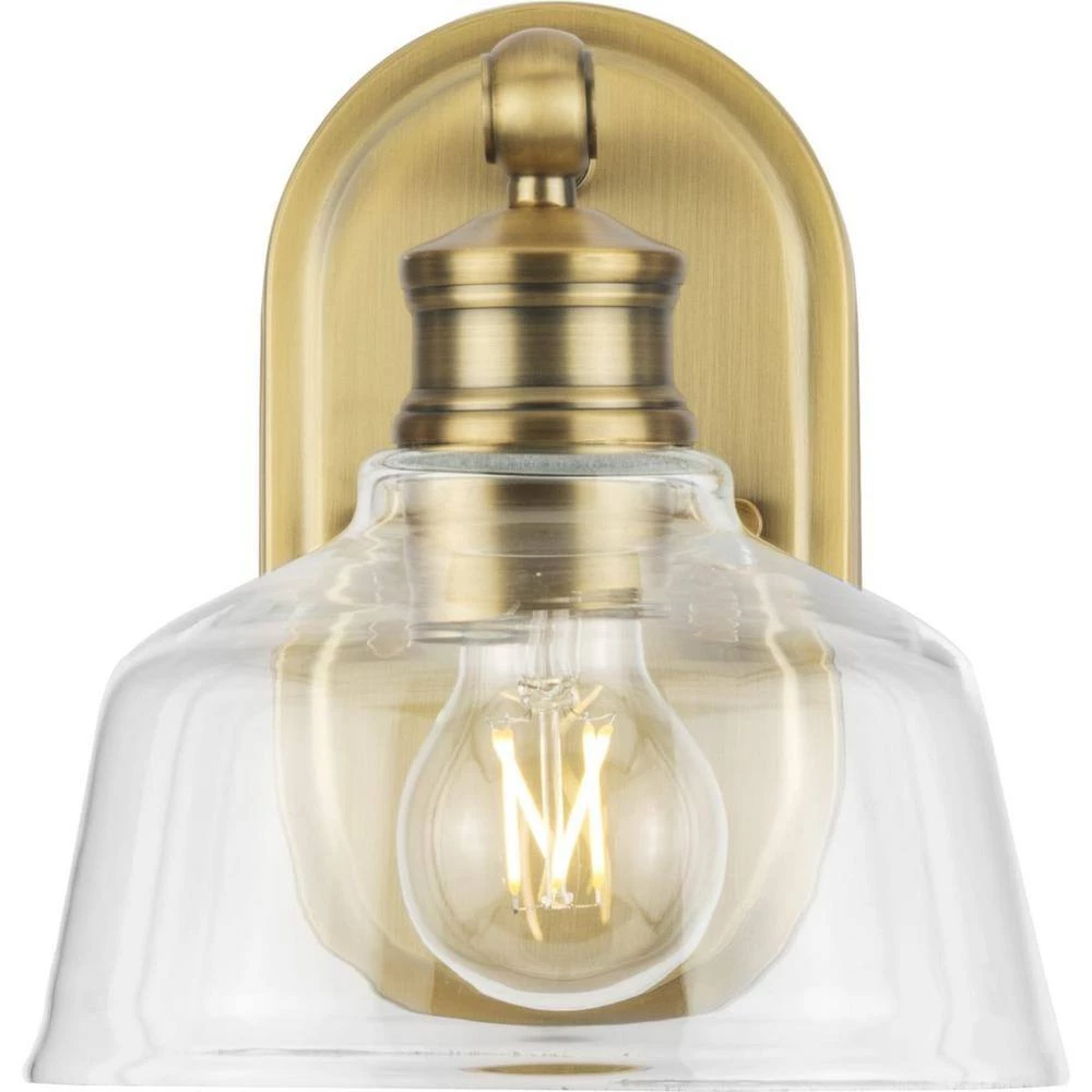 The Singleton Collection 1-light vanity fixture pays homage to industrial styling with an oversized warehouse shade fabricated from clear glass. A round backplate and vintage-inspired metal fittings finished in soft vintage brass create a timeless design. Place one on either side of the vanity mirror for optimal task lighting in the bath. This versatile vanity light can be mounted up or down, casting even illumination in any setting.