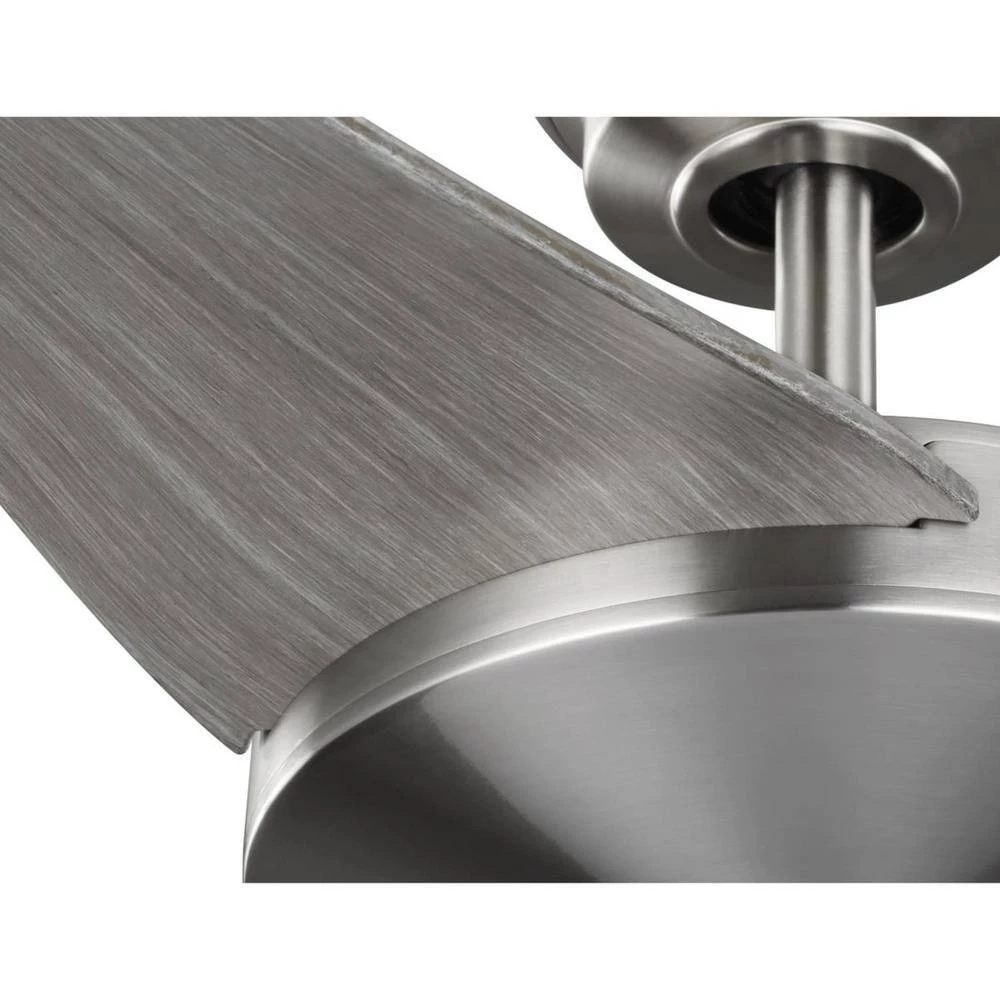 - 3 curved ABS blades with a grey weathered wood finish and brushed nickel accents