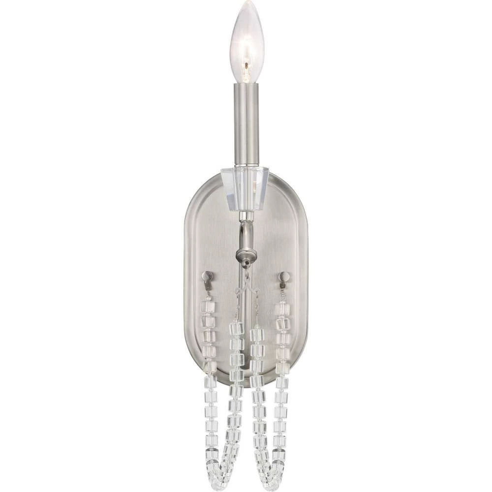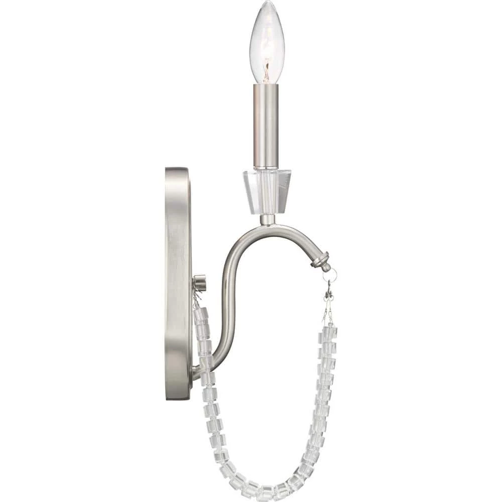 With a glamorous and modern appeal, the Stratham Collections one-light wall sconce features a sparkling string of cylindrical drops and opulent accent finials. The well-executed design adds dimension and overall depth for modern, luxury homes. Brushed Nickel finish.