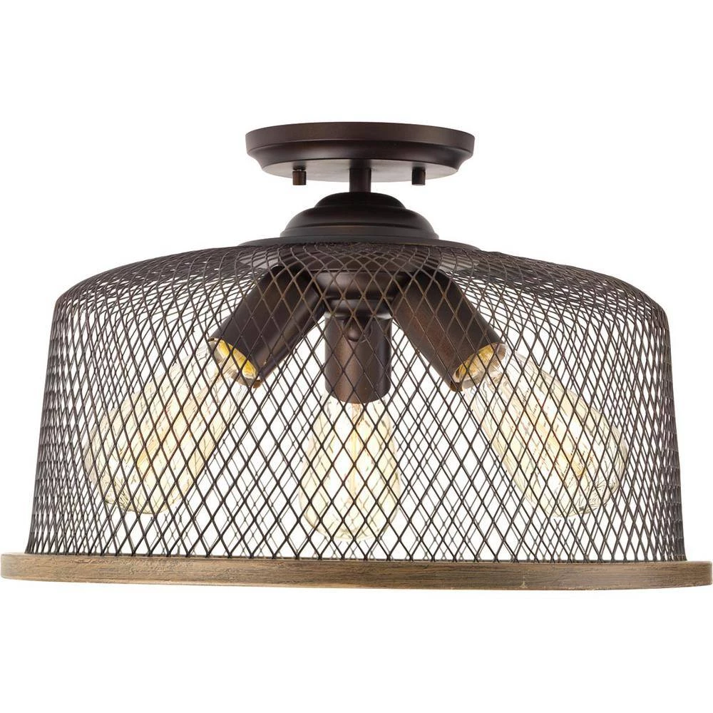 Rustic and vintage decor is a popular trend that can transform a home into a nostalgic retreat. Tilley features warehouse style shades formed from metal mesh that merge with a faux-painted, wooden rim for an artful yet industrial style. Antique bronze finish.