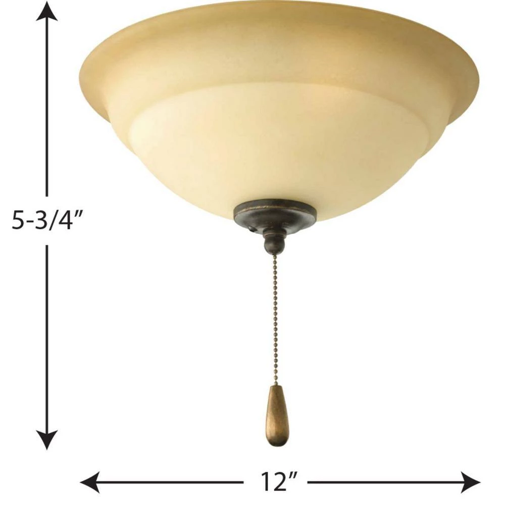 Two-light fan light kit that features a decorative lightly tea-stained glass bowl. Corresponding pull chain features Antique Brass with a medium oak fob. Universal style for use with fans that accept an accessory light comes with quick-connect wiring. Includes two 3000K, 800 lumen each (source), Title 24 certified LED bulbs.