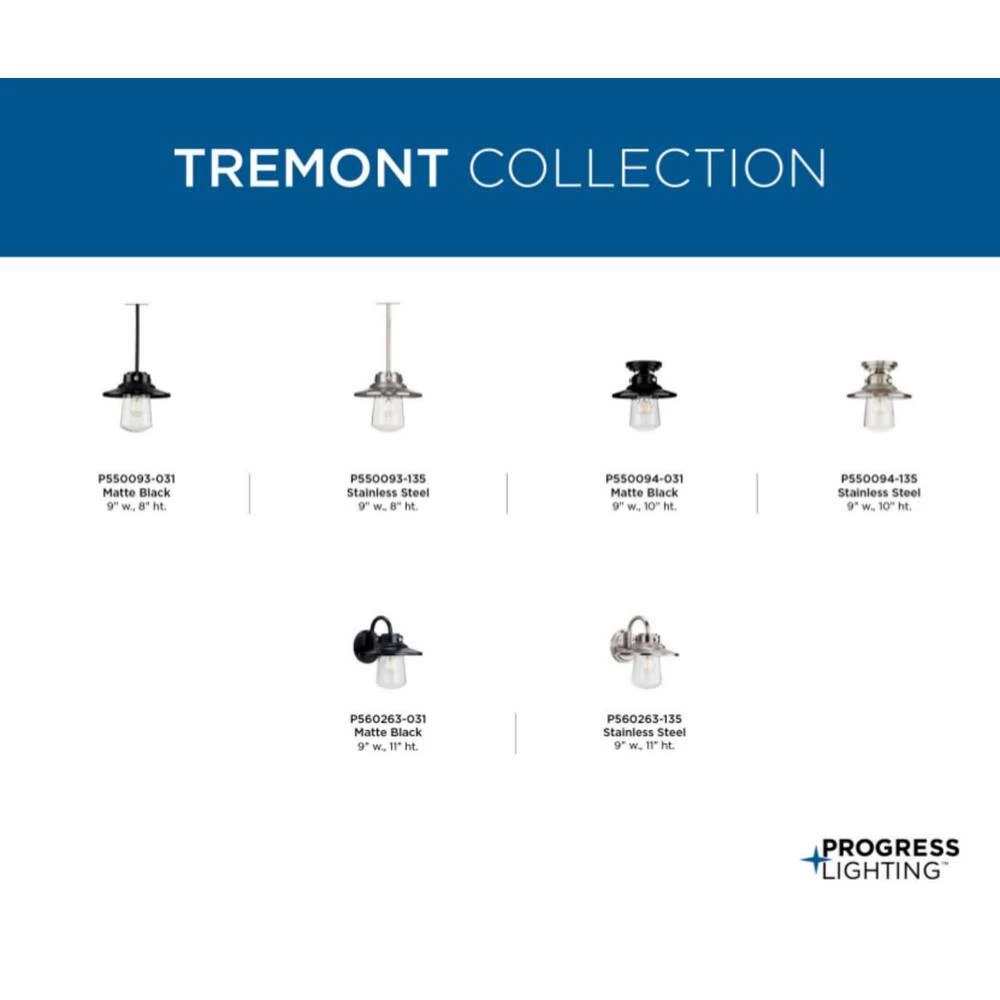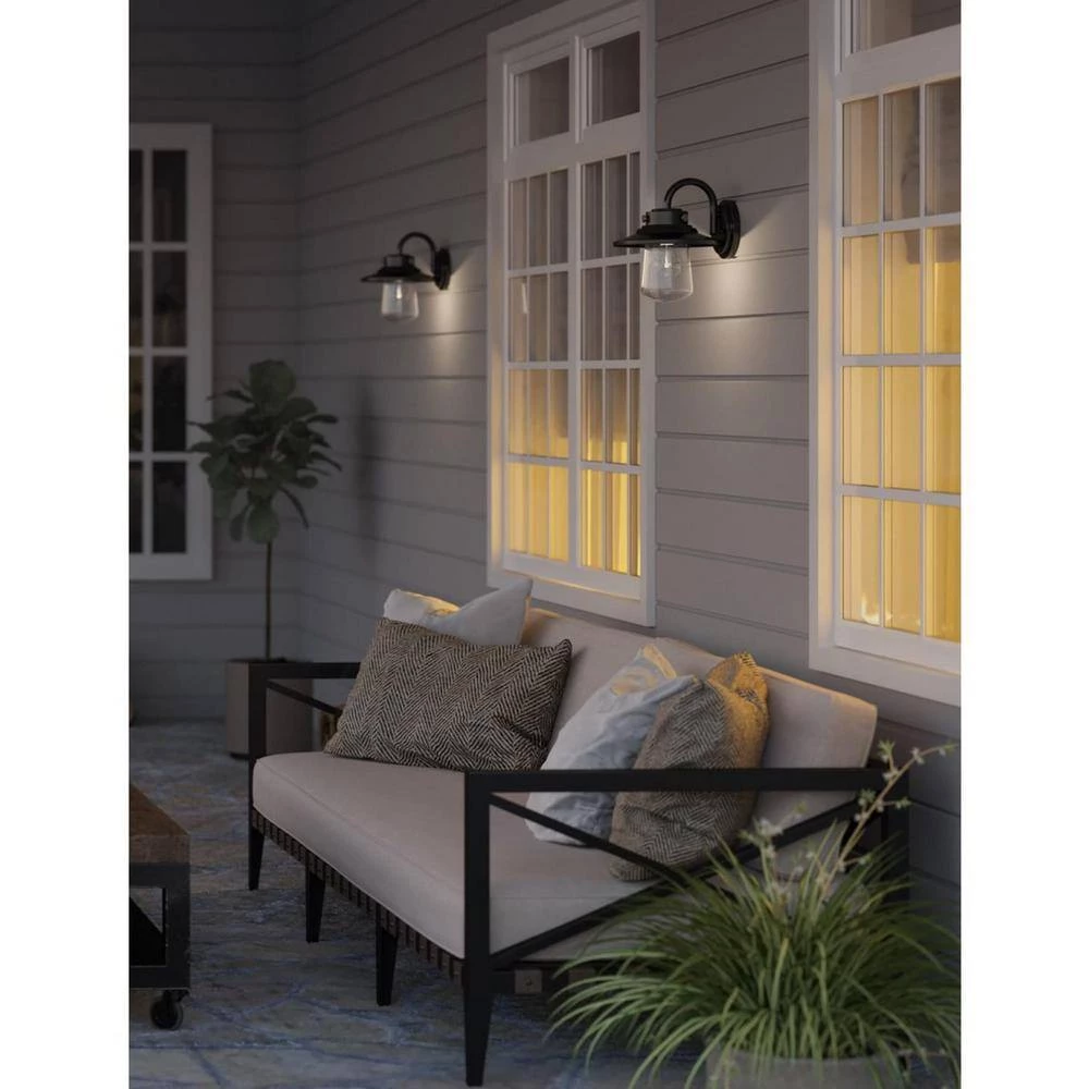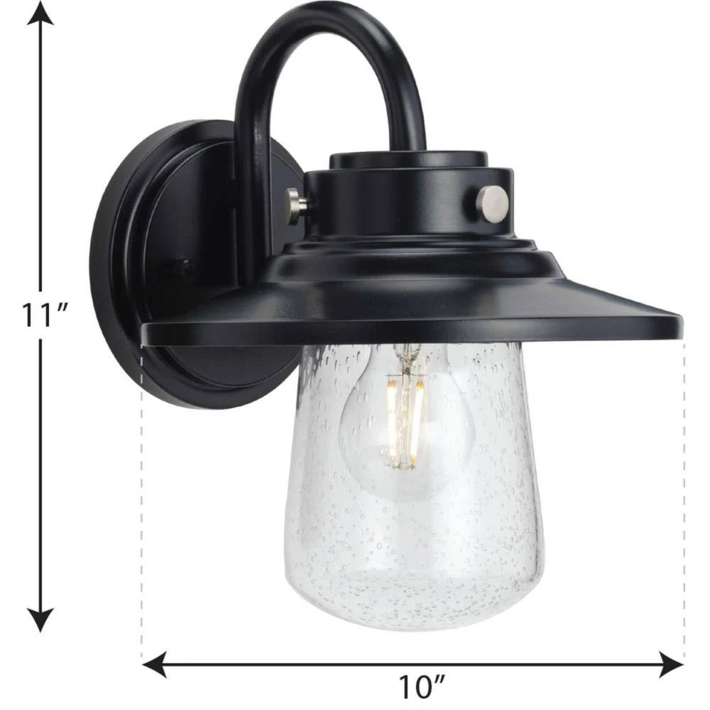 Welcome family and friends home with the Tremont Collection 1-Light Clear Seeded Glass Matte Black Industrial Outdoor Medium Wall Lantern Light. A light source glows from within a clear seeded glass shade reminiscent of raindrops on a window after a summer thunderstorm for a touch of rustic character. The wall light’s round backplate, curved arm and round shade decorated with mechanical stainless steel fittings are coated a matte black finish to accentuate the design’s industrial aesthetic for ideal illumination, use 1-medium base bulb that is sold separately (60-Watt maximum – LED/CFL/incandescent). The wall lantern is compatible with dimmable bulbs. The wall lantern’s rustic design is ideal for any porch, patio, deck, garage, barn, entryway, foyer or bedroom in coastal, farmhouse and urban industrial style settings. It’s time to breathe new life to the mundane every day with timeless and truly transformative lighting. Make your purchase today to begin your journey to a whole new lighting experience. Progress Lighting products are designed for exceptional quality, reliability and functionality.