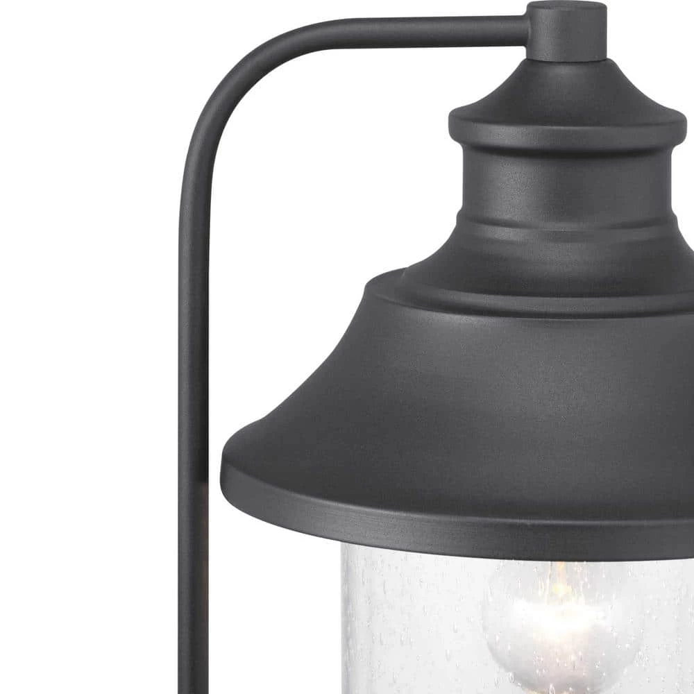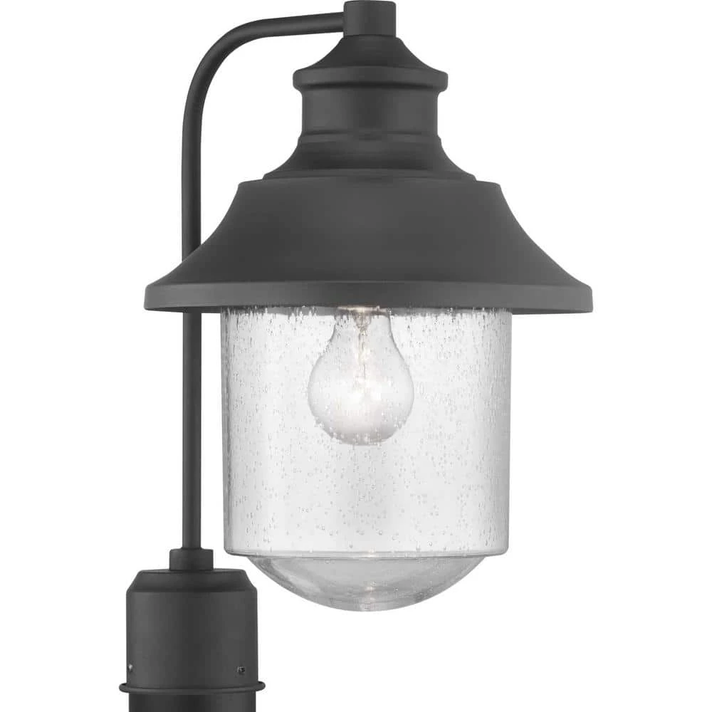 Featuring nautical influences, Weldon delivers a 1-light post lantern ideal for Farmhouse or Transitional architecture designs. Curved clear seeded glass is topped with an ample roof. Black finish. Clear seeded-glass shades resemble ships lights.